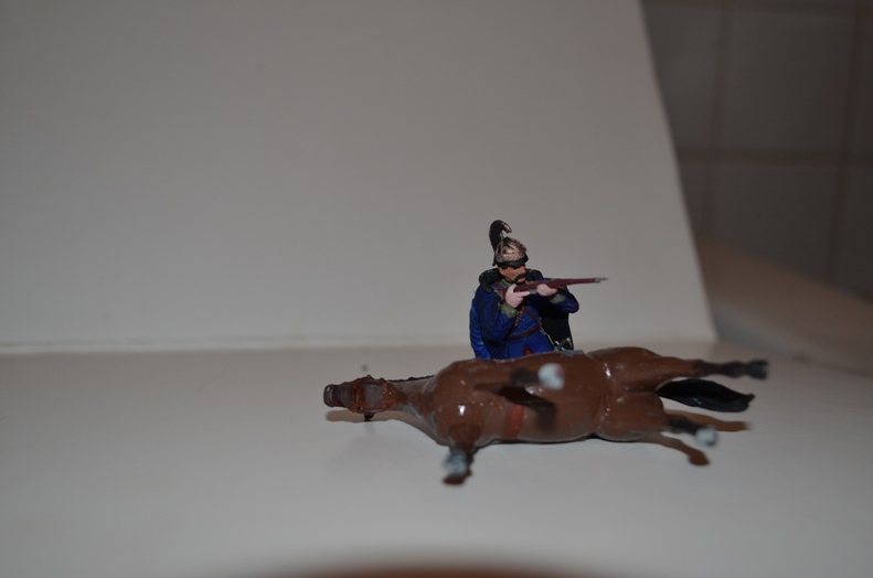 У стреляющего из винтовки драгуна (из-за убитой лошади) каска всё ещё мирного времени. Должна быть уже перекрашена в серый цвет - как у того, что с пикой.