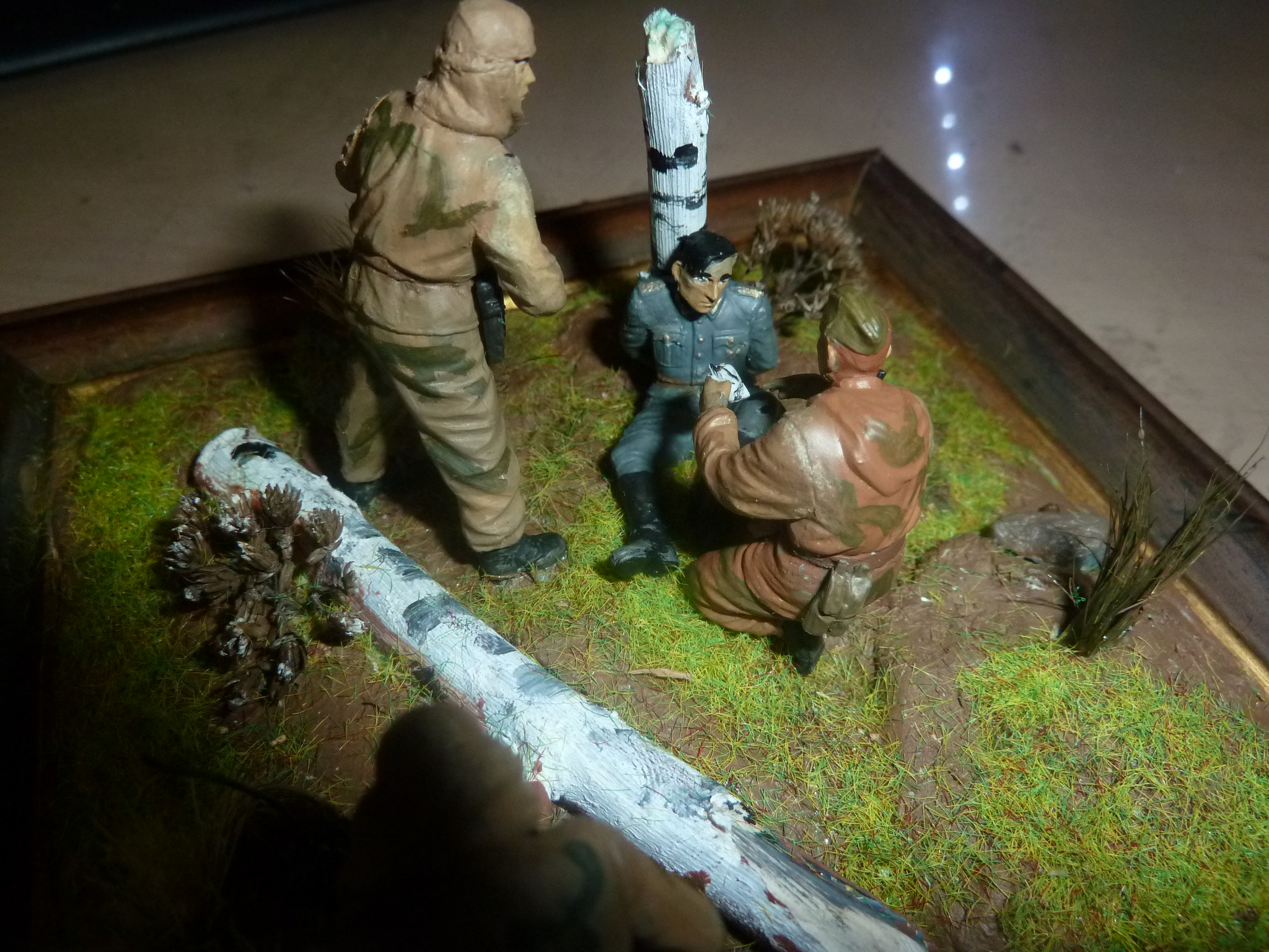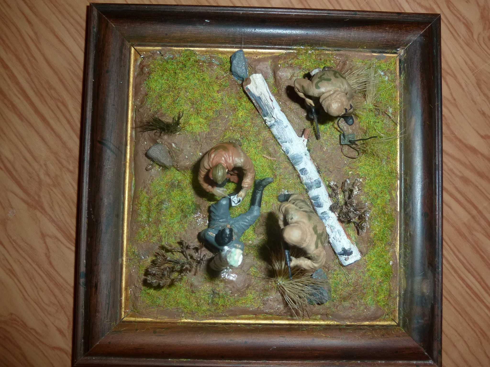 Не плохо но места соединения деталей, например руки и тела необходимо заполнить эпоксилином или шпаклёвкой. Траву можно заменить покрашенными волосками кисти, или синтетическим льном. Берёза как я понял- укропю Это заметно очень! Понравилась оправа. Успехов