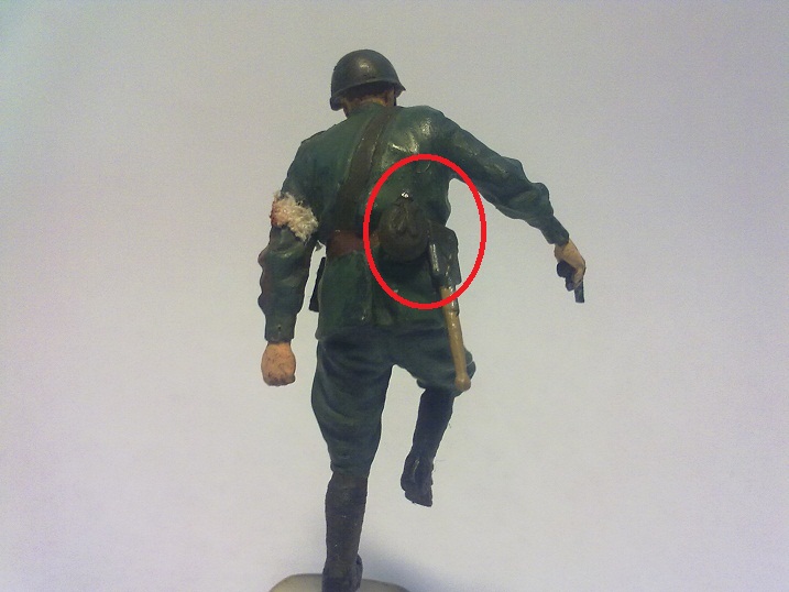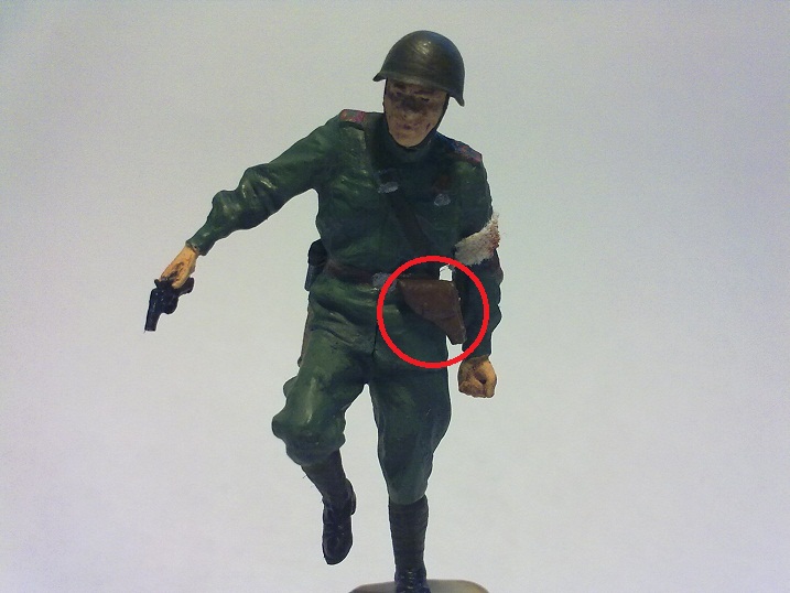 Учтя все недочёты, а именно пистолет ТТ мной был заменён на "Наган"(сделал из Эпоксилина), поднял фляжку на уровень ремня, изменил слегка кобуру и сапёрную лопатку, обильное кровотечение смыл и заменил ватно-марлевой повязкой, слегка промочив кровью.Вот собственно и всё.