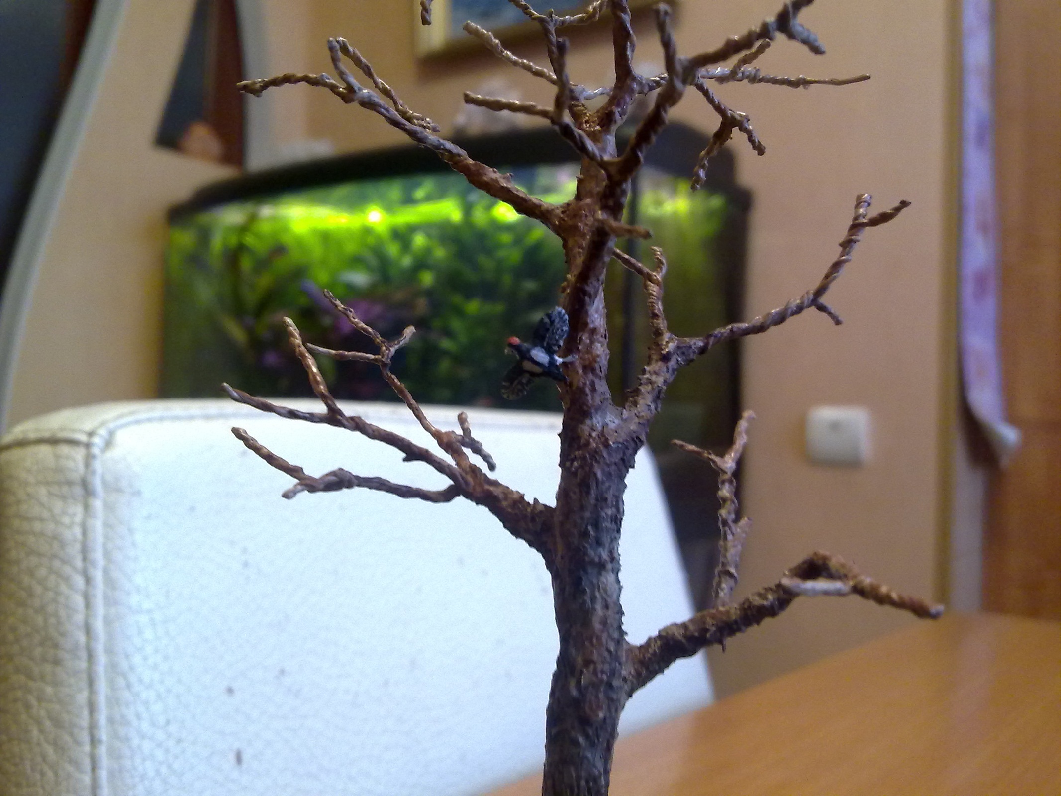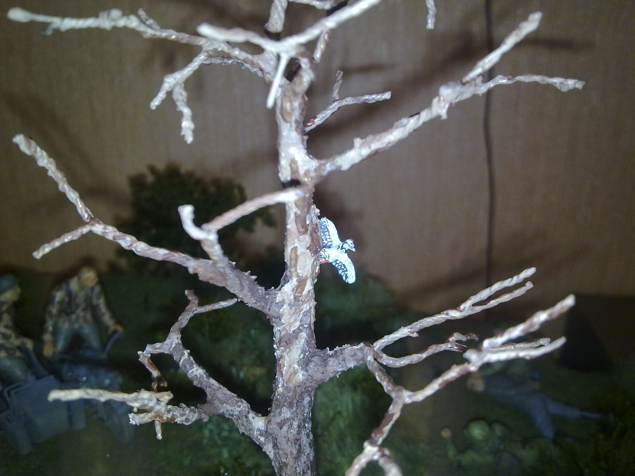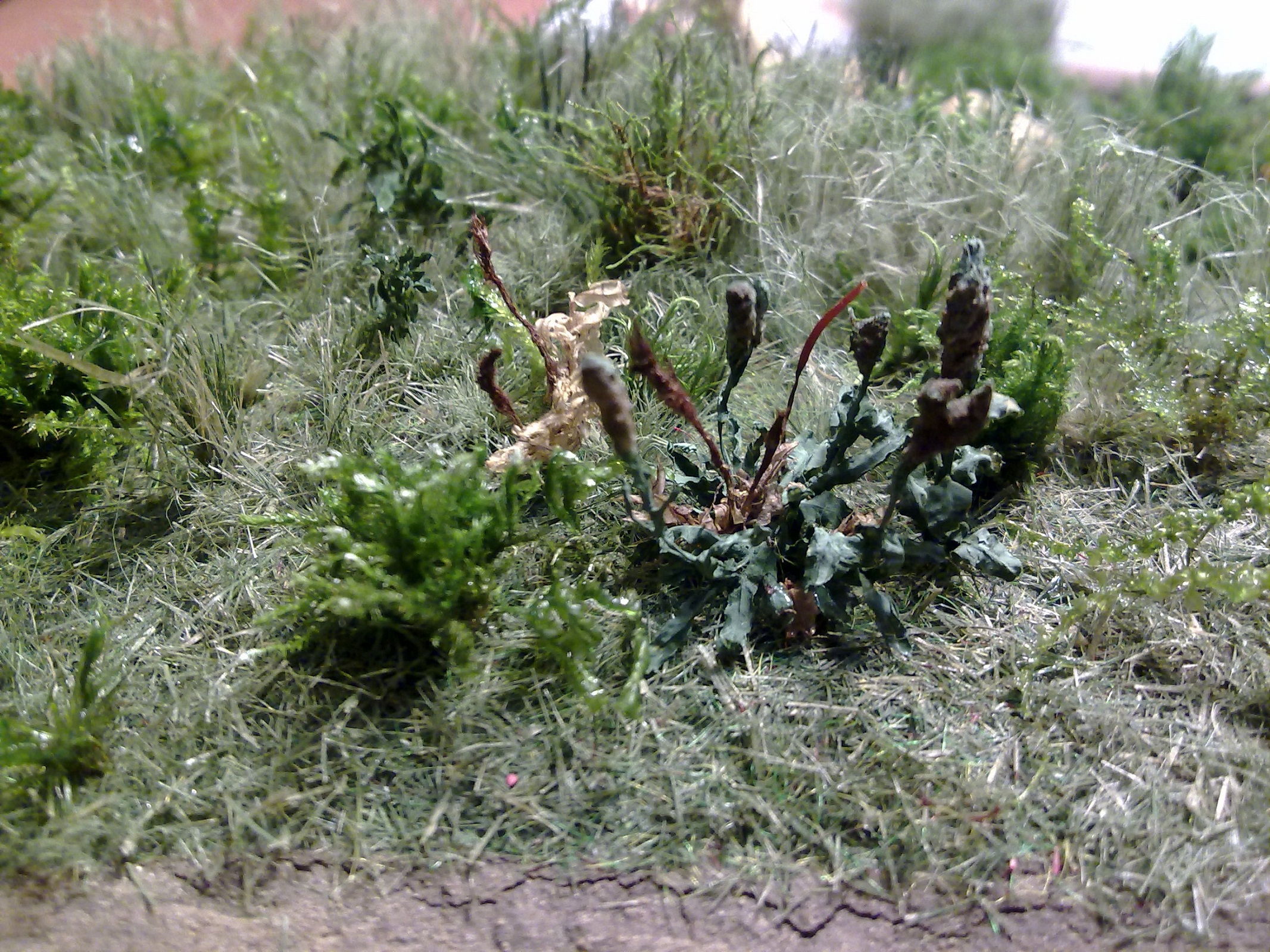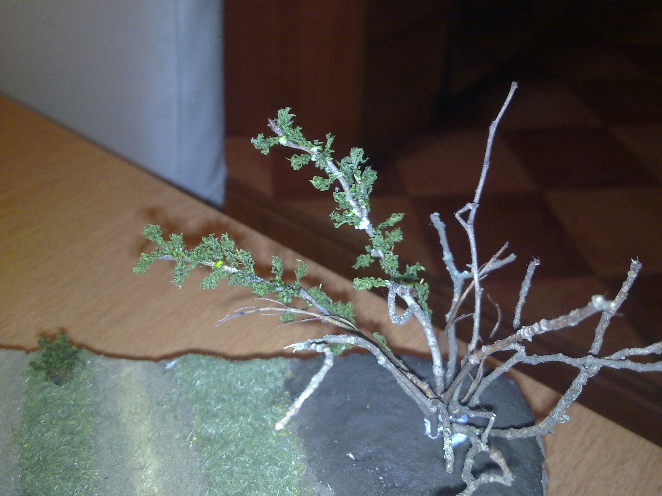 Основную лужайку делал из пакли,описаний много,покрасил аэрографом в 2 цвета потом нарезал около 3 мм и посыпал поверхность.Куст сирени из маленьких веточек и мха(нашел в лесу осенью)и остальные кустики из мха 4-х видов.Мох очень хорош тем что его можно сбрызнуть водой и он оживает,раскрывается,эффект классный,я смешал немного глицерина пва и воды и просто кисточкой прошелся по мху.Деревья из проволоки и тамиевской шпаклёвки,краска тоже тамиевская.Земля и песок натуральные из огорода тёщи