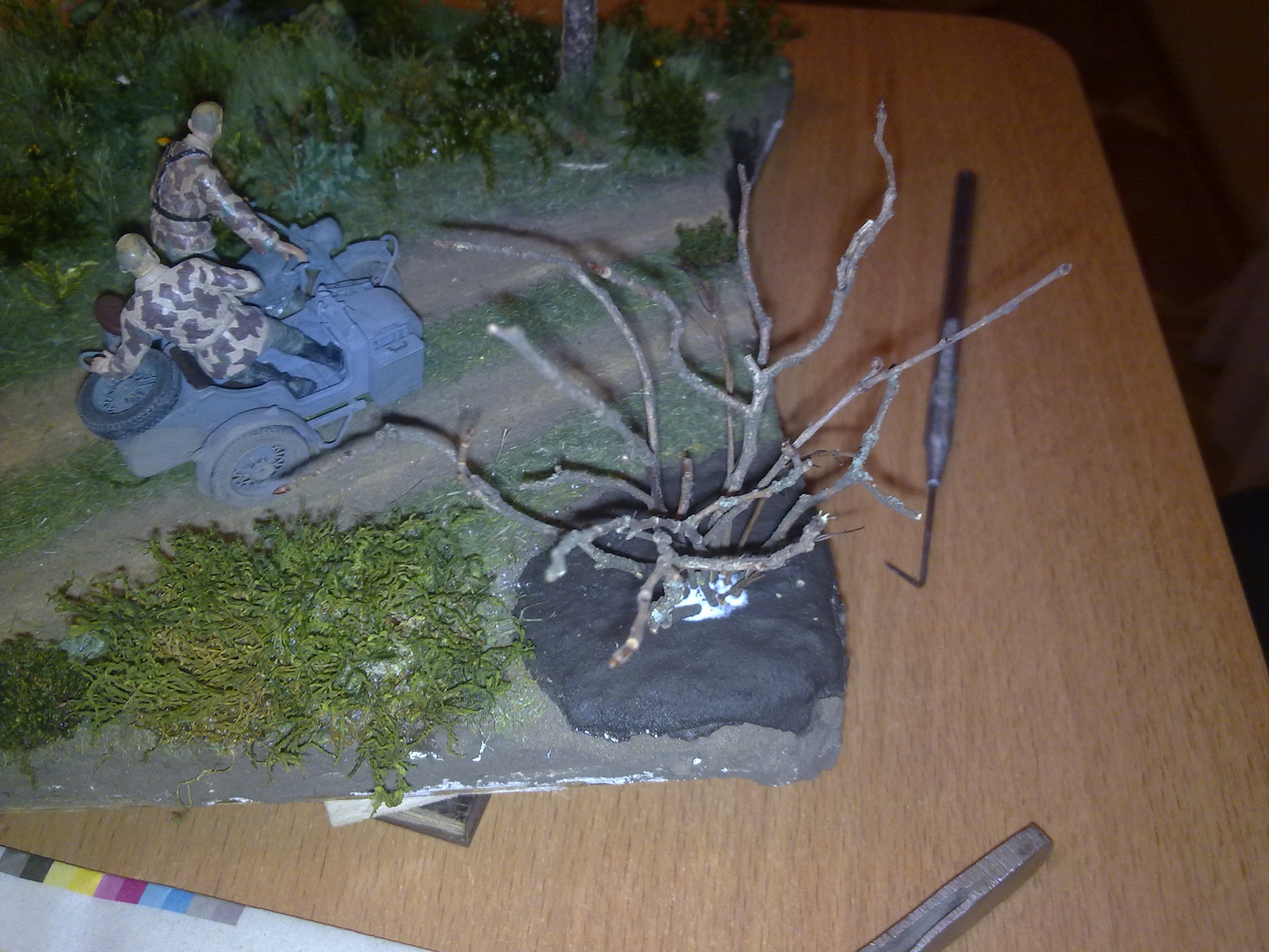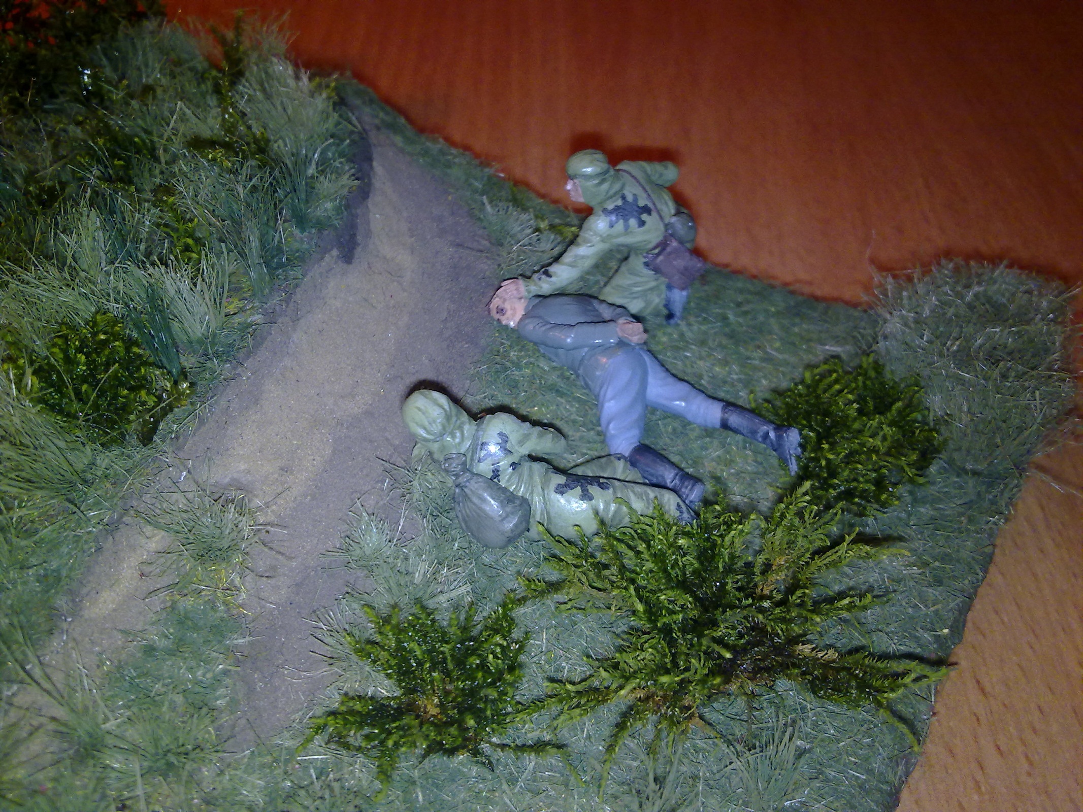 Их еще и не красили, только штаны у пленного. Судя по всему человек выложил эскиз будущей работы, чтобы мы оценили растительность. Мне она понравилась. Хороший такой лесок. еще листву на деревья и кустарников добавить, чтобы разведчиков немцы с дороги не увидели