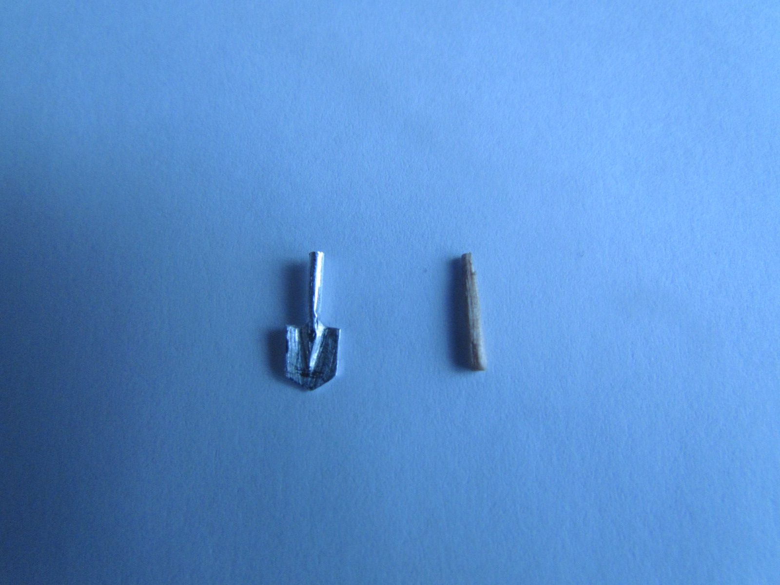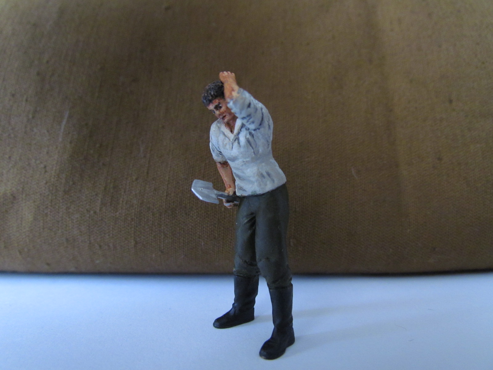 Тело, голова и правая рука самодельные из пластики, рукава рубахи и волосы -двухкомпонентка. И уделю внимание лопатке, выточена из аллюминия( специально еще не красил в 4БО) ручка из зубочистки. Красил акрилом, но еще нужно штаны довести до ума и колени замарать. Первая полноценная фигурка. Жду советов и критики!