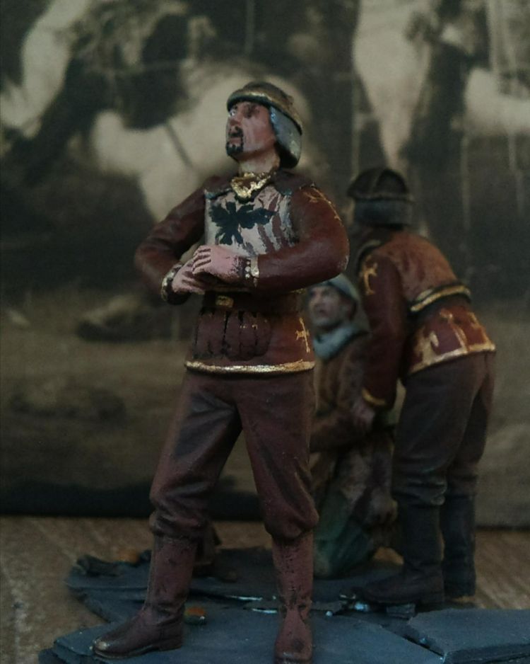 Здравствуйте. Вот я и решился выставить свою небольшую (вру- меньше!) виньетку. Сюжет прост, но добр: Византийский торговец, возвращаясь с рынка, споткнулся и упал, при этом разбив ящик с оставшимися апельсинами. Два стратиота (византийское ополчение), патрулируя квартал, увидели это и решили помочь. Пока один из них, стражник с одним глазом, разгоняет толпу зевак, другой помогает торговцу подняться. Все фигуры конверсионные, окрашены темперой и акрилом Тамии. Это моя первая работа на сайте, ну то есть, вообще она далеко не первая, потому я немного волнуюсь, но все равно буду рад услышать критику и советы.