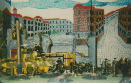 Решил и я выложить свою диараму. Изготовил её в 1994-1995 годах. При переезде она естественно не сохранилась А фото сделанные палароидом остались. Миниатыры солдат покупные из пластмассы фирмы "Звезда".Сборка,покраска и ландшафт сделаны самостоятельно. Одно несоответствие. Экипаж немецкого танка (Тигр) а фактически танк (Пантера)