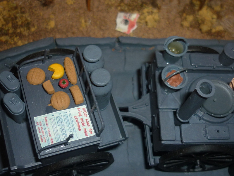 Видимо, это и в самом деле они. Рядом с продуктами на передке кухни лежит огромных размеров агитационная листовка на немецком языке, озаглавленная "Гитлер не может выиграть войну" (далее неразборчиво: вероятно, по пунктам приводят аргументы и призывают сдаваться). Немецкому повару наличие на рабочем месте такого предмета доставило бы много неприятностей. Как вариант: захваченная в качестве трофея кухня используется американцами для кормёжки немецких военнопленных. Поел немец, и заодно получил порцию "духовной пищи" в виде пропаганды. Либо листовка служит немецким перебежчикам талоном на получение питания.:helmet: