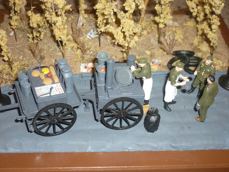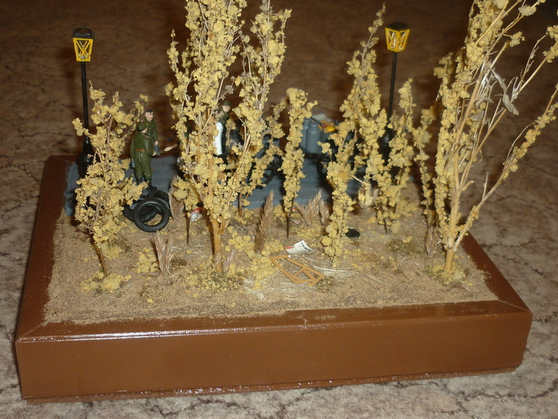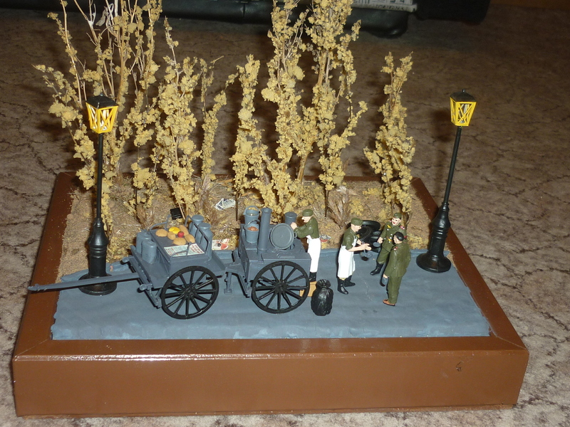 Каркас деревянный брусок. Немецкая полевая кухня "Tamiya", уличные фонари и растительност (НЕ ВСЯ) от "масШТАБ", мусор и плакаты "Miniart", краски "Звезда". Землю делал сам, это песок нанеснный на ПВА.