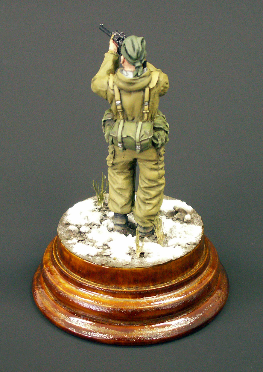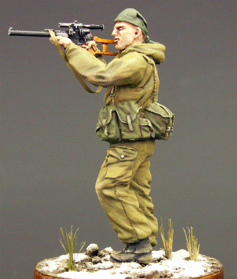 Проработка фигурки, в целом, хорошая. Единственный косяк, который заметил уже после покраски – неверное положение рук заданное производителем. Руки нужно было спиливать в местах локтевого сгиба, заделывать шпаклевкой и приклеивать заново, а также исправлять положение кистей, чтобы линия прицела находилась на уровне глаз снайпера. Решил изобразить момент вскидывания винтореза бойцом. Еще миг – и он прильнет к прицелу.