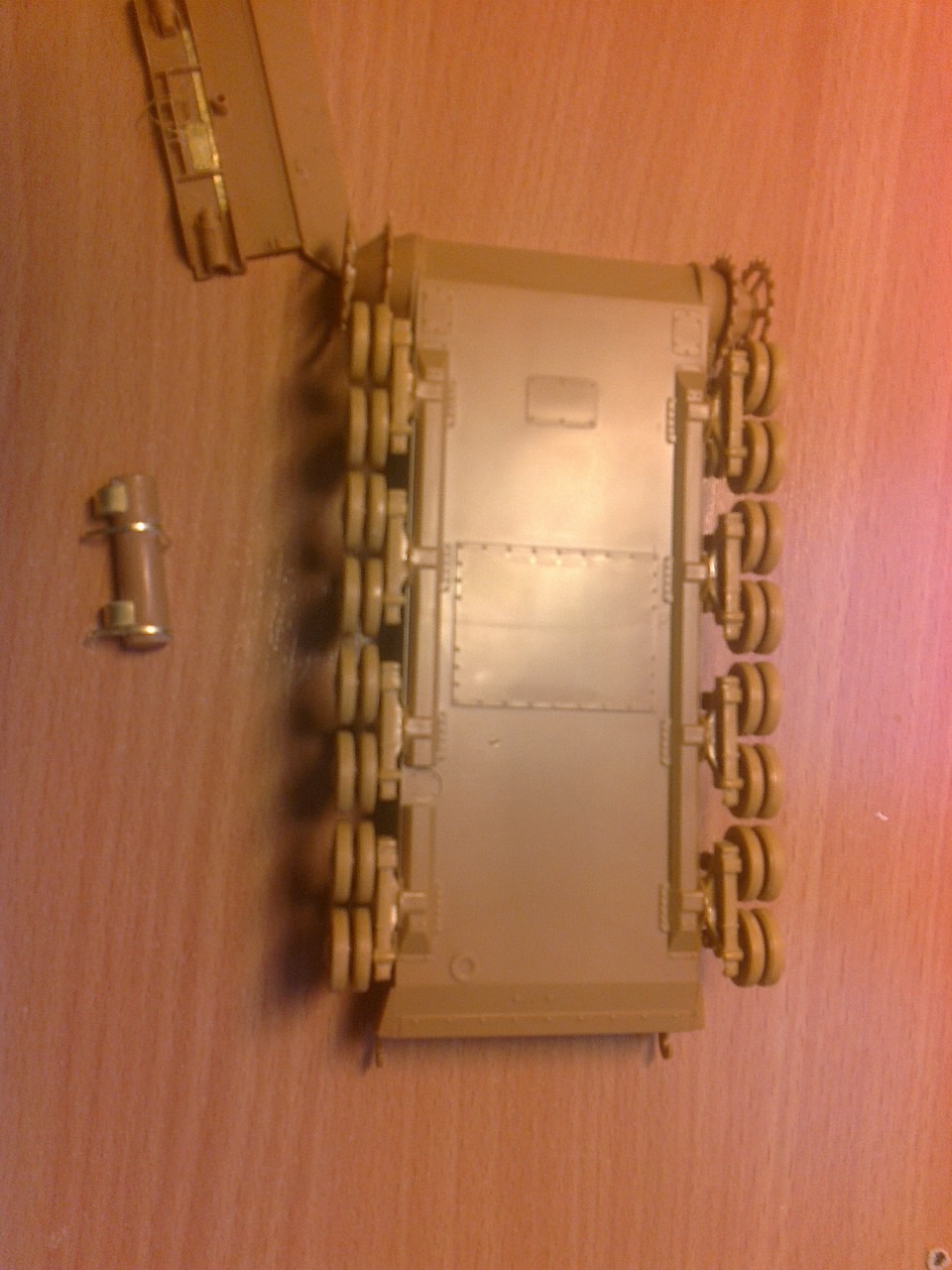 Ну наверное рановато катки приклеивать сразу, а как потом их красить будешь.Я бы сначала покрасил их отдельно, потом между собой склеил, и к модели клеил бы в последнюю очередь, к покрашенному корпусу.