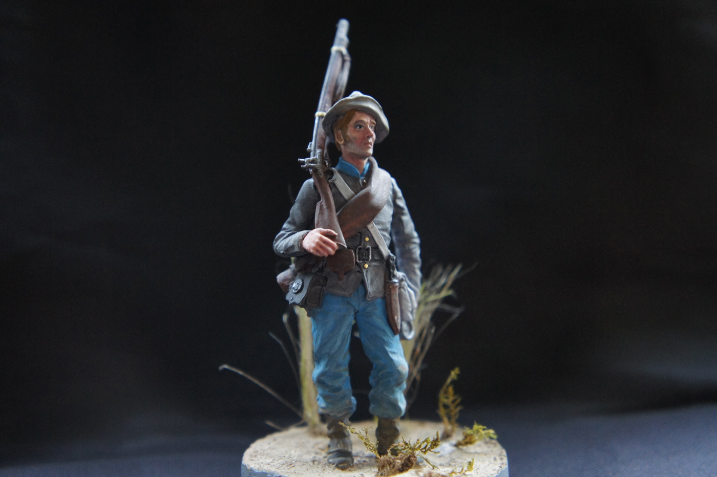 Джонни замечательный! Видимо начало войны: форма новая, чистая. Немного смутило основание: выглядит несколько "пустынно", солдату бы или по траве идти, или по дороге. Сама фигурка очень понравилась: наверно первый бой, на лице видно волнение. Удачи и Успехов! С Уважением.