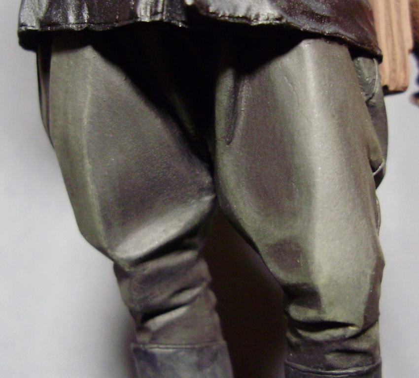 У этой фигурки командира пузыри на шароварах такие же, как на обычных галифе и на кожаные штаны с реконских фоток не похожи, поэтому просто красить их в черный цвет без радикального перетачивания кроя и складок не пойдет. Сделайте обычный хаки, чай не эсэсовец.
