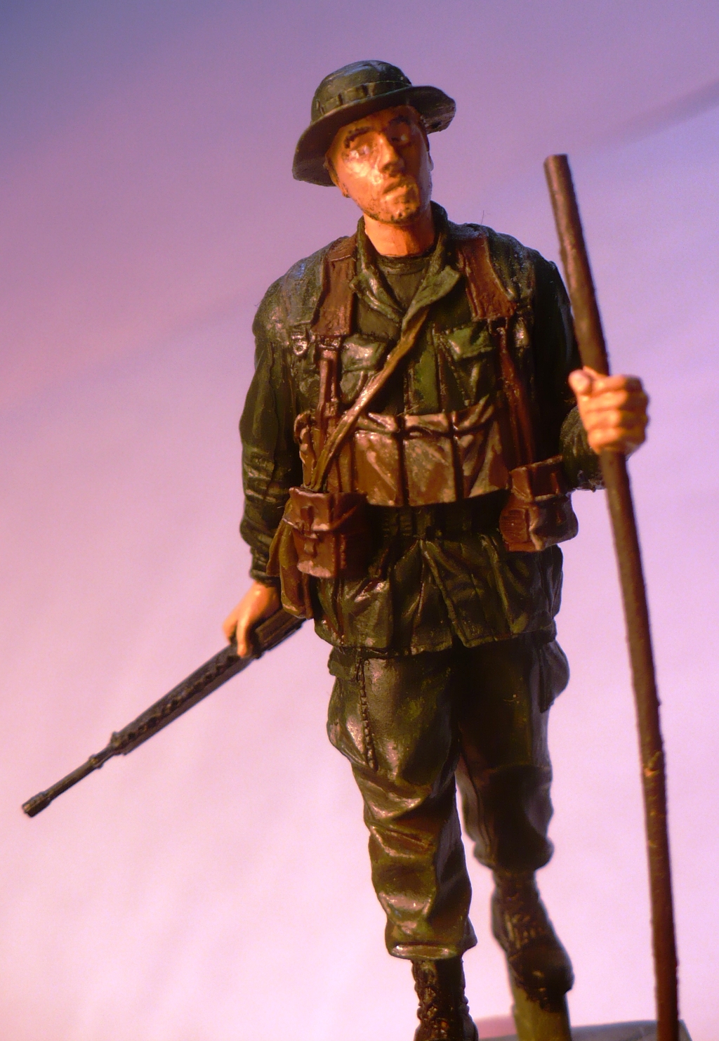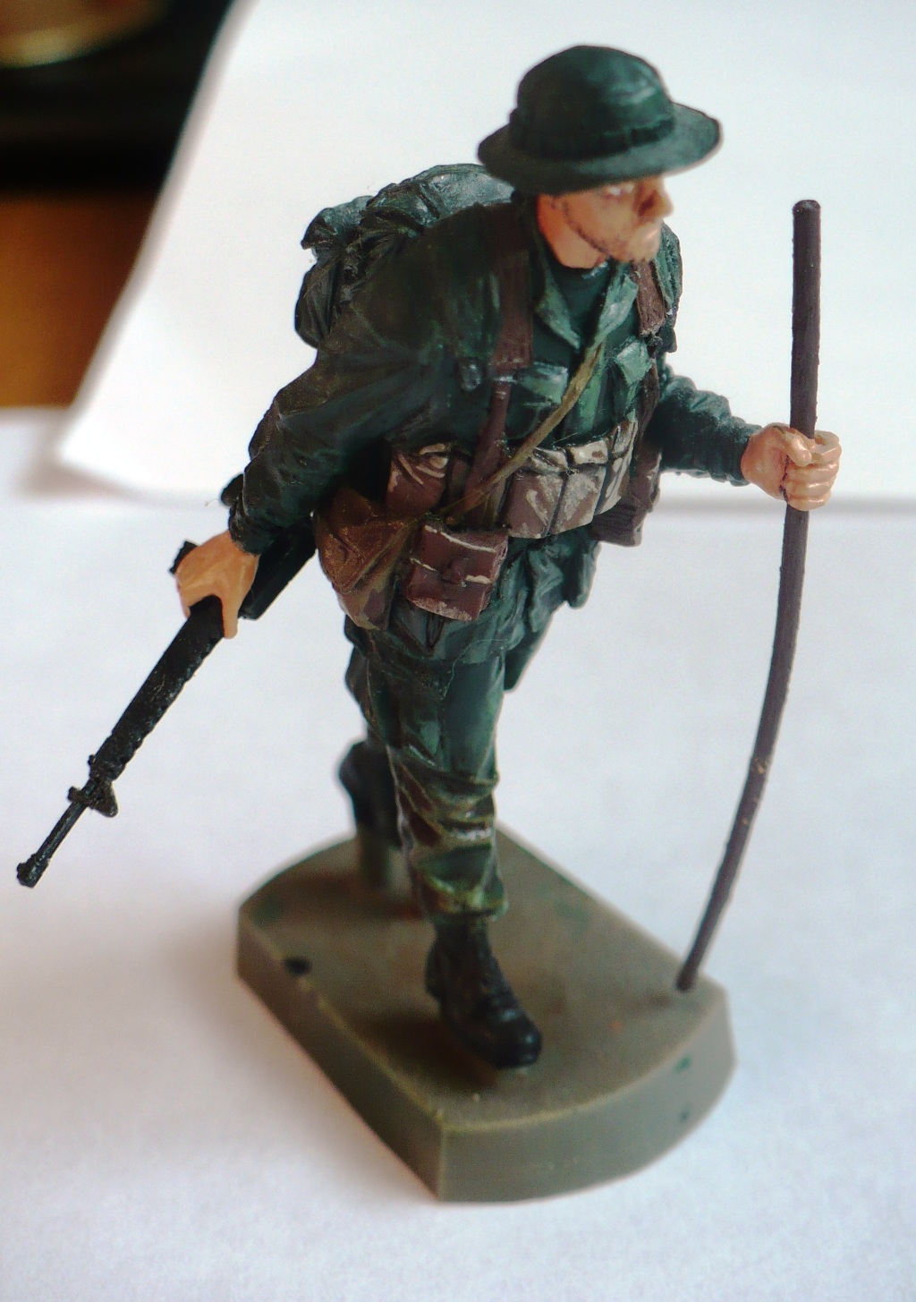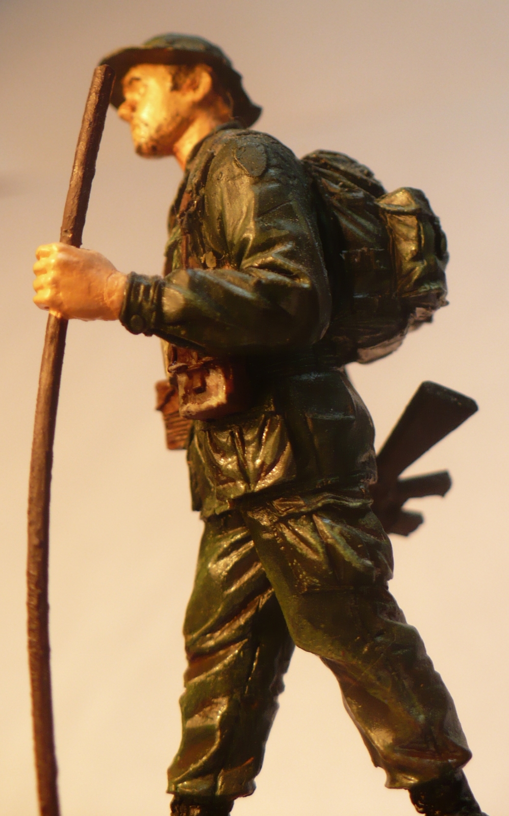 Смоляная фигурка фирмы BRAVO6, красилась тамиевским акрилом около года назад. На цвет формы за основу взят J.N.Green, в углублениях смешаный с водкой flat brown, на подсумках flat black. Выступы и складки делал сухой кистью, салатовым цветом. Ноги были тонированы пигментами МИГ, до получения "мокрого" ощущения. Вариант без каких-либо дополнений и измененний.