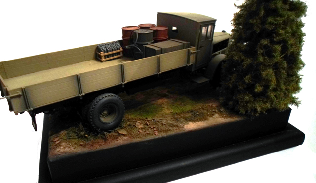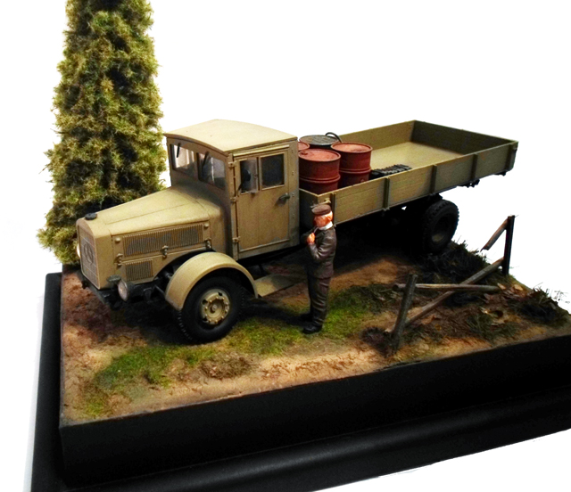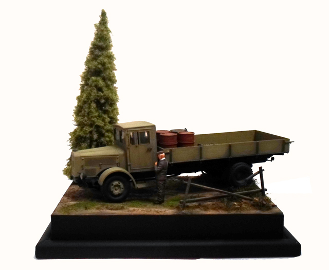 Грузовичок и мужичок, я так понял, с другой диорамы переехали? А по елочке не все понятно. Издалека вроде гуд. А вблизи? Разветвленности лап характерной не будет.