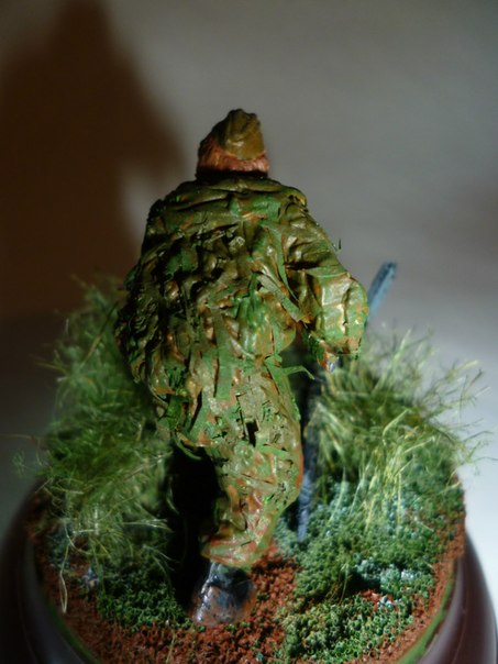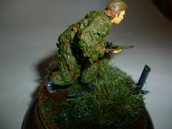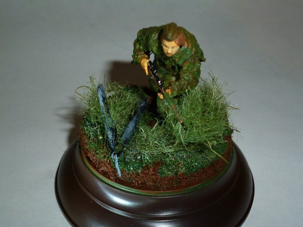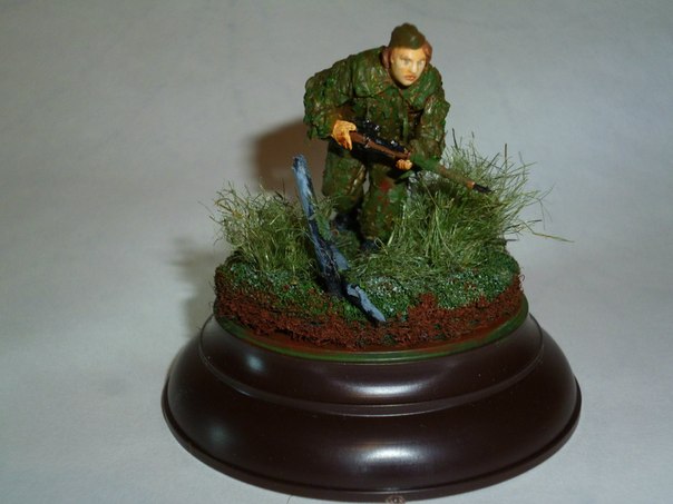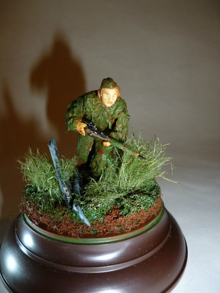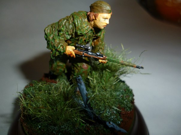 Здравствуйте.С волнением выношу на ваш суд мою первую оконченную работу.Жду отзывов,критики и советов.Фигурка из набора "Звезда"(советские снайперы),основание от "Мини Арт",краски: акрил "Звезда".