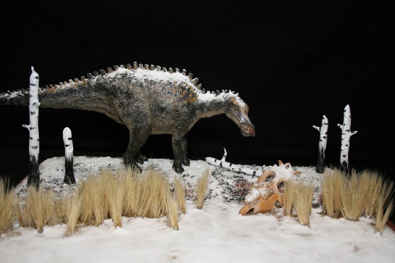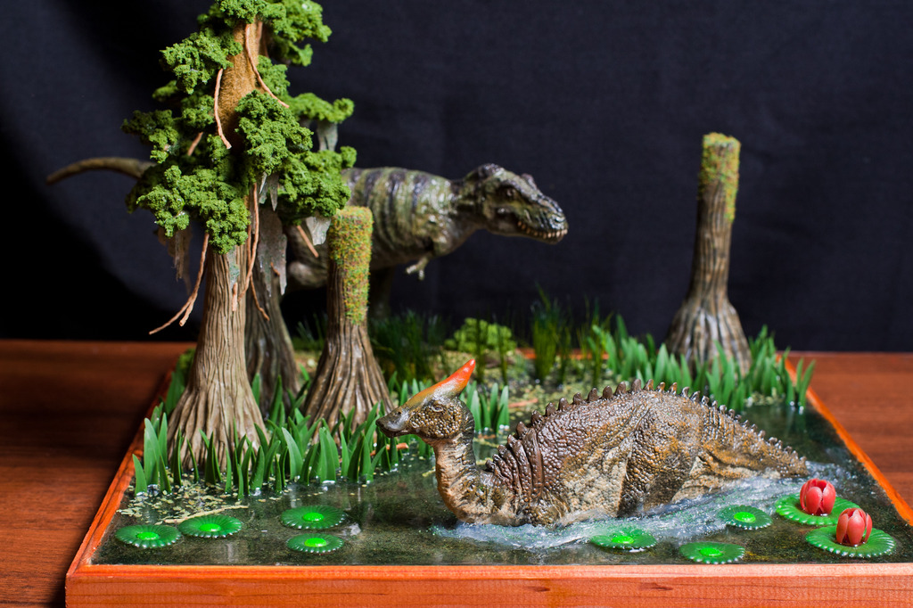 Касательно тираннозавра-его нет ни на первой,ни на второй диорамах.Это близкородственные животные Ти-рексу,входящие с ним в одно семейство.На первой диораме представлен Tarbosaurus efremovi ( голотип ПИН № 551-2) с промерами пропорций из обзорной работы Малеева(1955).Второй Albertosaurus periculosus-сейчас не валидный тираннозаврид из Приамурья описанный по крайнефрагментарному материалу Рябининым в 1932 году.Тут я несколько дал волю фантазии взяв за основу скелетную прорисовку Г.Пола.