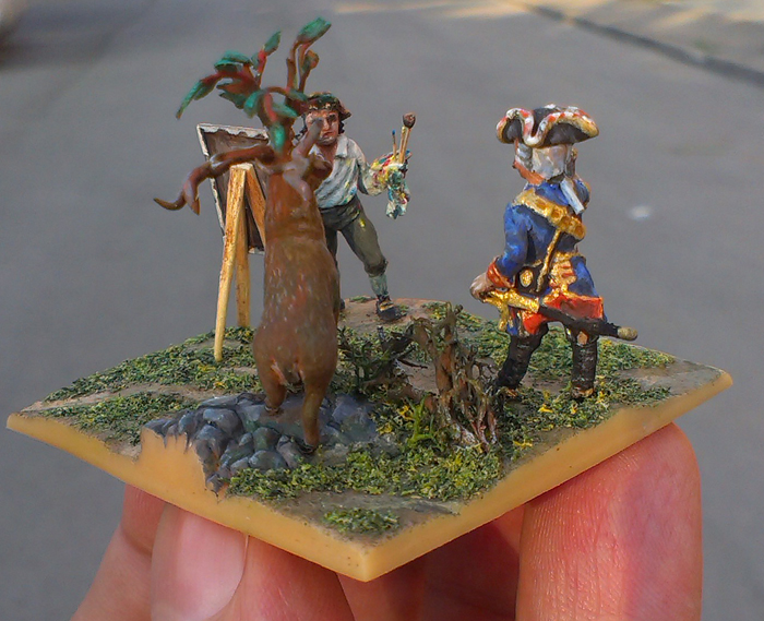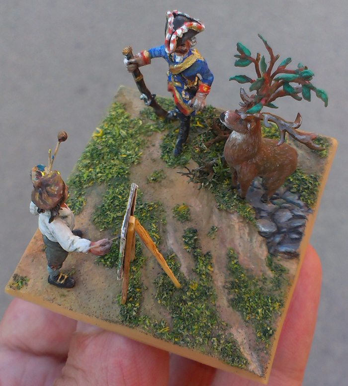 Отличный образец "мирного творчества" в жанре военной миниатюры! Очень нравится. 72-й масштаб опять же - не для слабых духом! Но сюжет автор по-моему не совсем правильно озвучил. Барон здесь не на охоте, т.к. у оленя уже выросло вишневое деревце. На охоте он был раньше, а здесь, специально взяв художника, надев свой "Специальный Охотничий Мундир" с золотыми позументами, напудрив парик и заранее договорившись с оленем, пошел позировать для истории