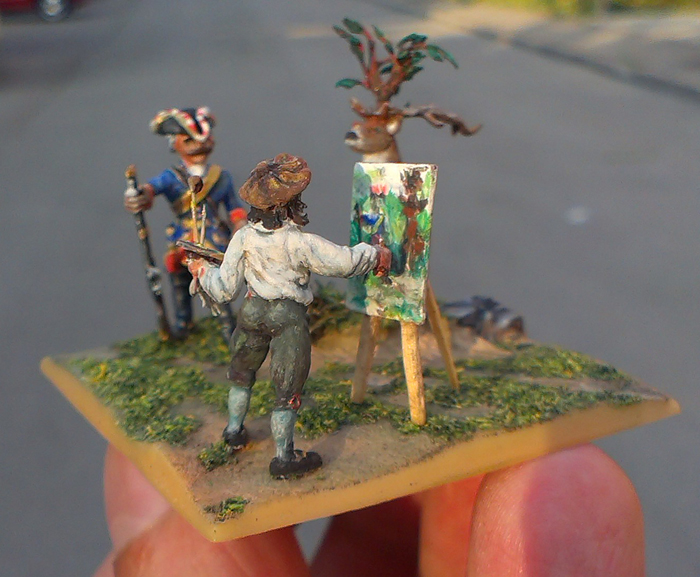А вот теперь - нравится! По деталировке не скажу: я такую мелочь даже не берусь красить, представляю как трудно. Но роспись неплохая! Особо отмечу что на мольберте не просто холст измазаный красками, а видно то что рисует художник ( а это уже не 72й, это ещё меньше!) И хоть пиво я продул - думал просто встреча оленя и барона будет - всё равно очень понравилось.
