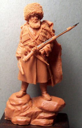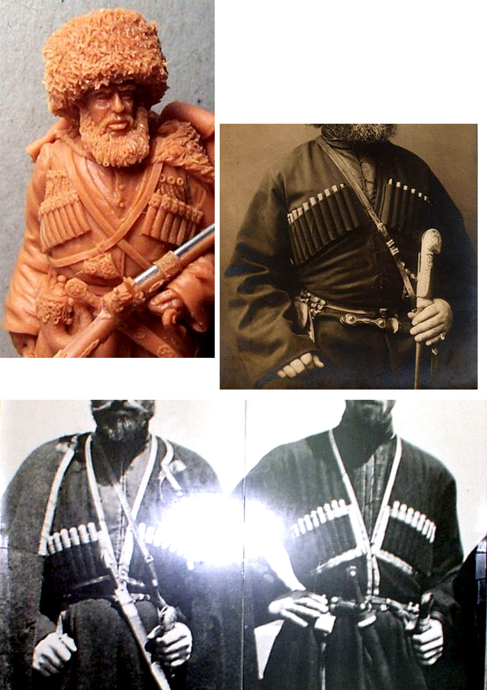 Может я и не прав, но не кажется ли уважаемым спорщикам, что пошли требования к точному воспроизведению некоей конкретной фотографии или рисунка, чего здесь как раз и нет? Автором представлена фигурка простого горца, не являющегося представителем вооружённых сил государства и, следовательно, внешний вид его костюма может быть любым ( разумеется если он не противоречит традиционным для горца покрою, стилю и способу украшения – а он и не противоречит на данной фигурке). Горец середины века мог нацепить ( и цеплял) какую-нибудь деталь, оставшуюся от костюма прадеда из предыдущего века. А стили и деталировка могут варьироваться от селения к селению если не сильно, то весьма заметно. К тому же если учесть ещё и материальное положение, социальный статус и чисто кавказские понты – то тогда вообще лепить не стоит, ибо всегда можно докопаться до таких деталей что ой-ой что начнётся.