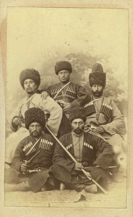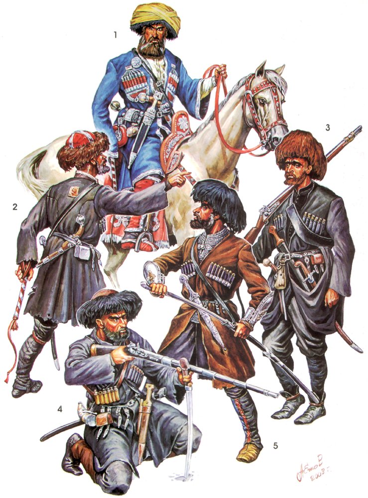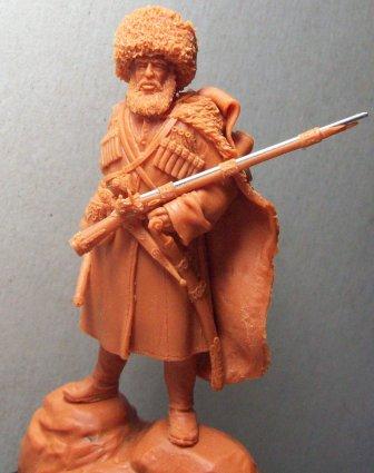 Разговор шел об изменении черкески.Что касается обуви-где здесь армейские сапоги?По папахе могу сказать следующее-утверждать,что изменения произошли в сторону увеличения мехового околыша несколько неточно.Скорее всего имело место одновременное использование разных типов папах,что потверждается фото.Если уж в армейских подразделениях шел такой разброс-что говорить о всех других. На рисунке Ежова справа виден товарищ с пуговицами на бешмете.Кроме того на персонажах можно наблюдать все виды папах.Вы не забыли,что фигура 54мм?