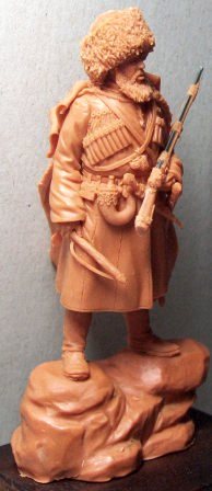 Спасибо за замечание.В свою очередь отвечу.Ружье и ручка нагайки намеренно сделана толще для удобства пролива.Что касается ружья,то они разные были, в том числе и менее изящные.Привожу так же покрой черкески и способы ношения шашки.Что касается газырей, то они соответствуют описанию современников на тот период.Цепочки применялись и несли чисто утилитарную цель-к ним крепились крышки зарядов.Обратите внимание, что они имеют колечки в верхней части.Ну и напоследок-обувь.Поэтому фигура сделана не по мотивам, а как аутентичная ВИМ.С уважением.