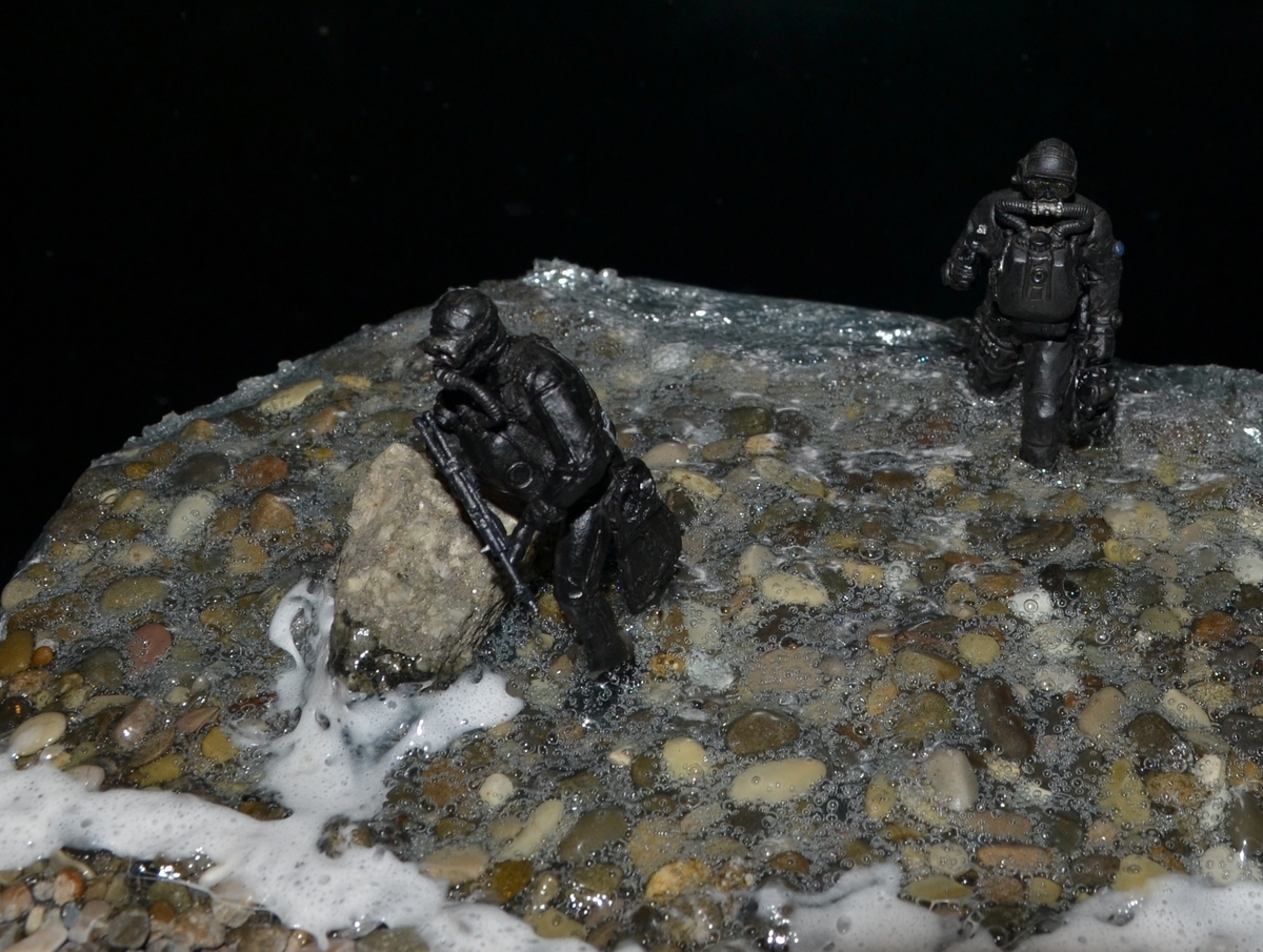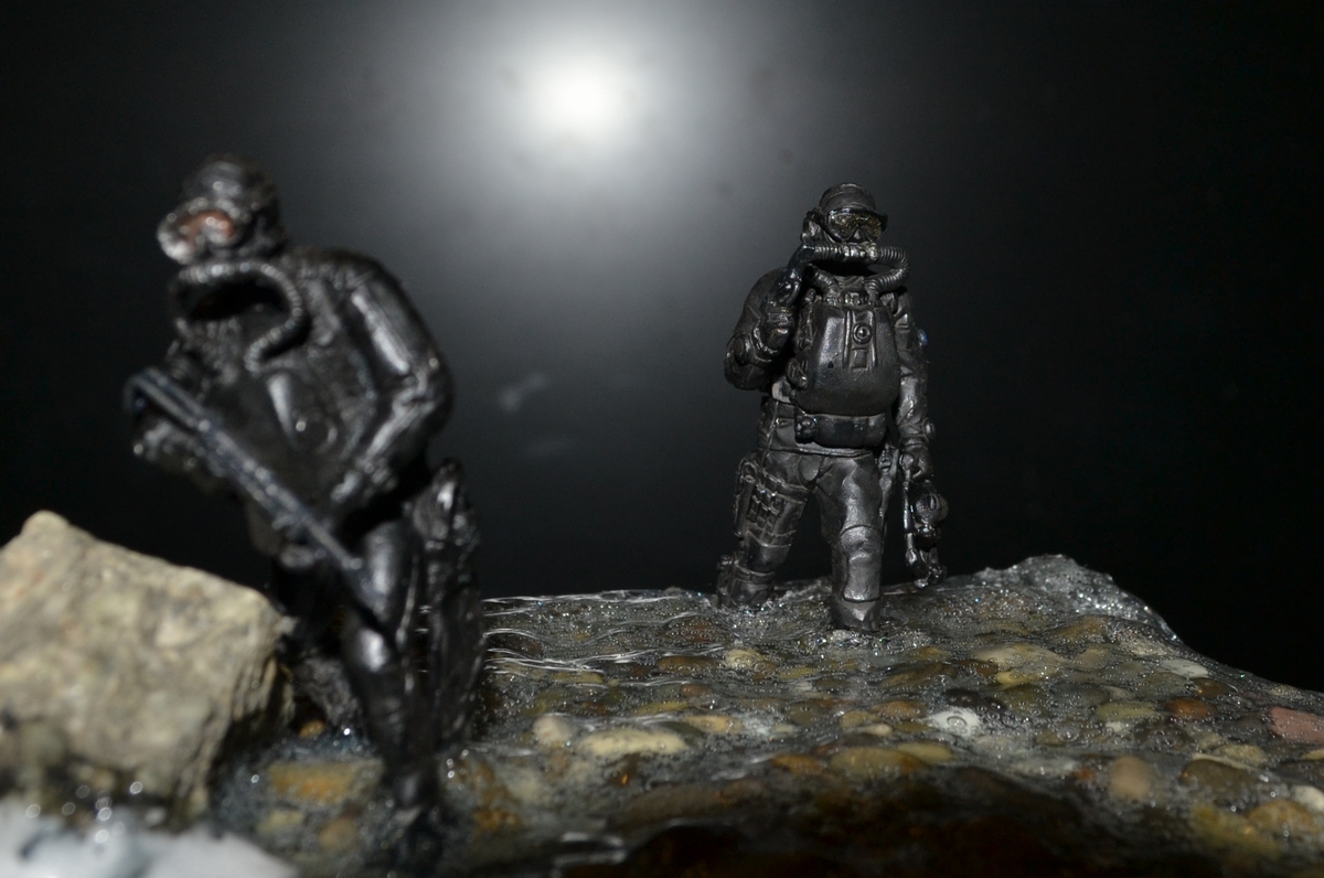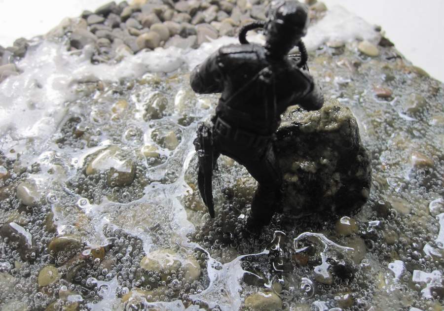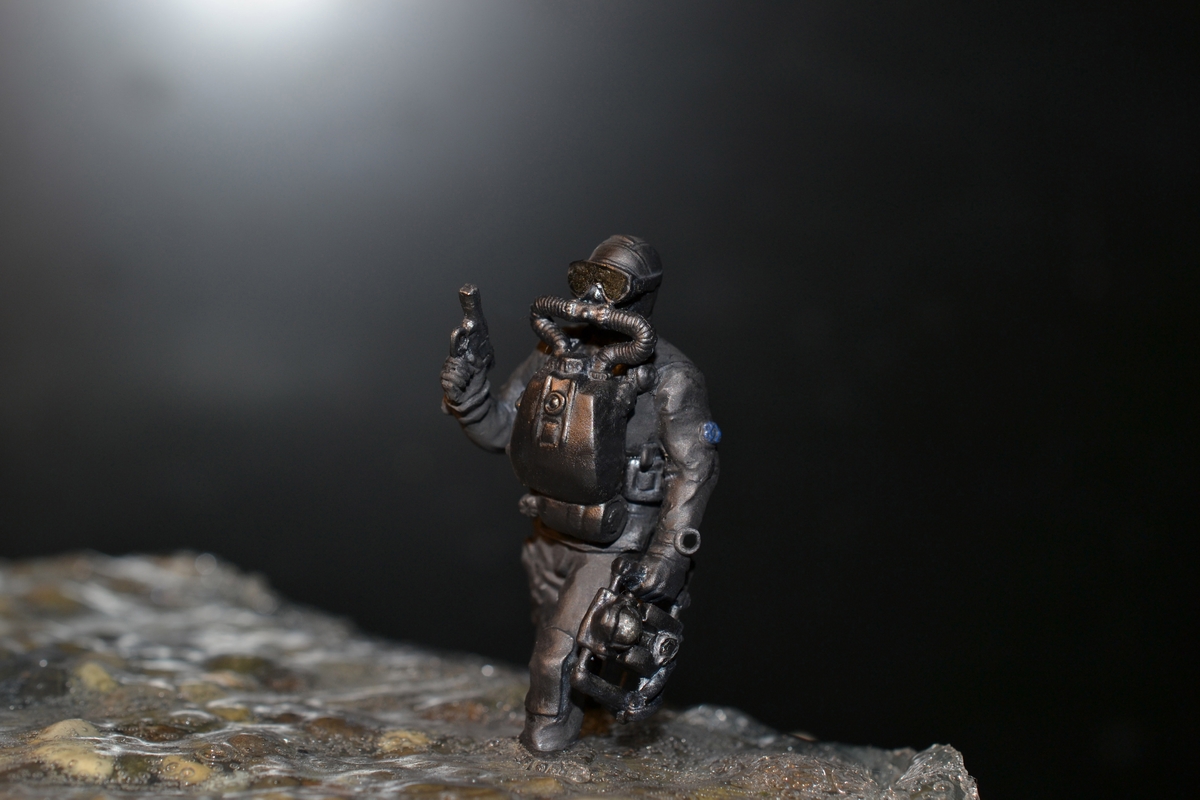 синей тамия. Сам боевой пловец покрашен чёрной матовой из балончика, дал эффект мокрого костюма, грузила и ремни - серая и чёрная матовая тамия. Стекло маски клей титан.