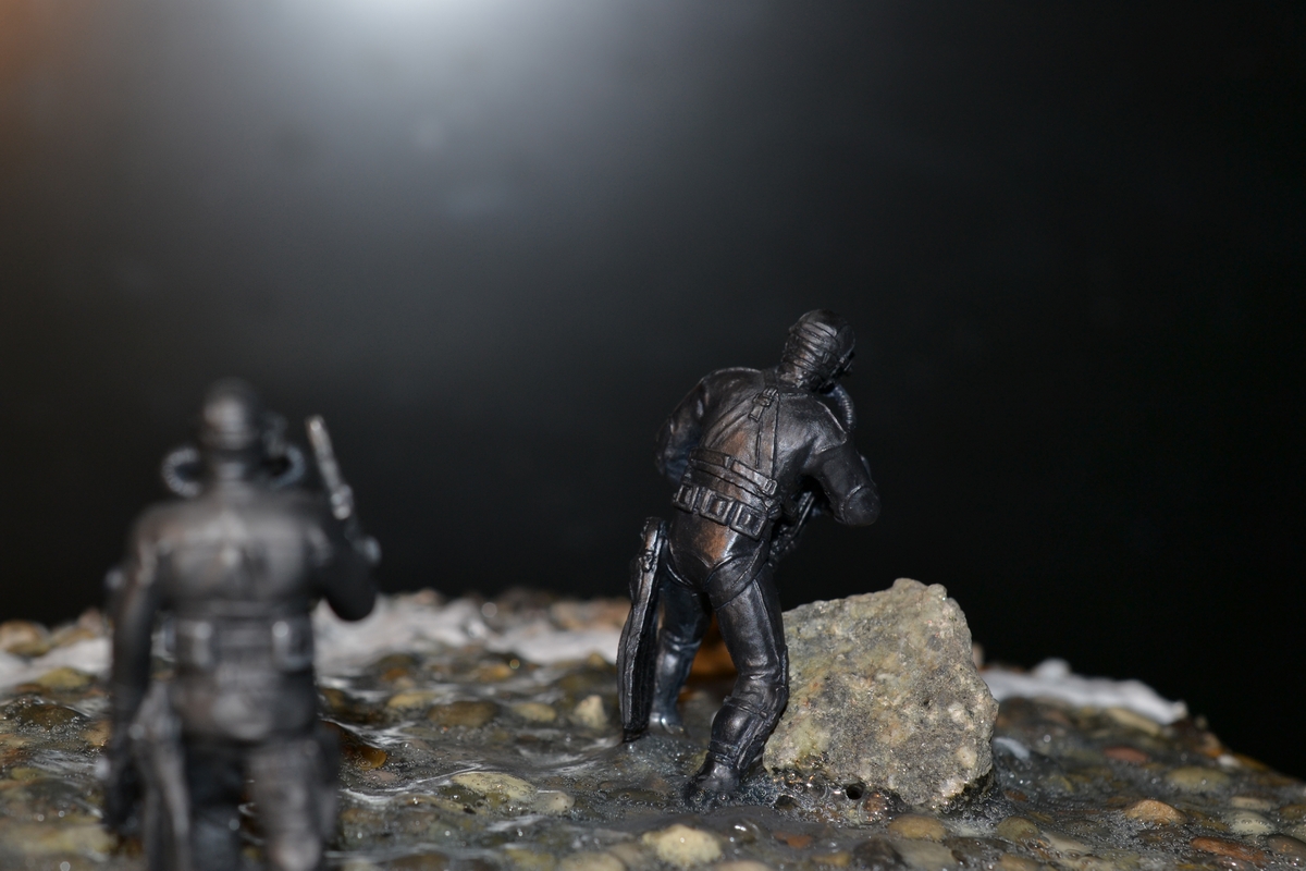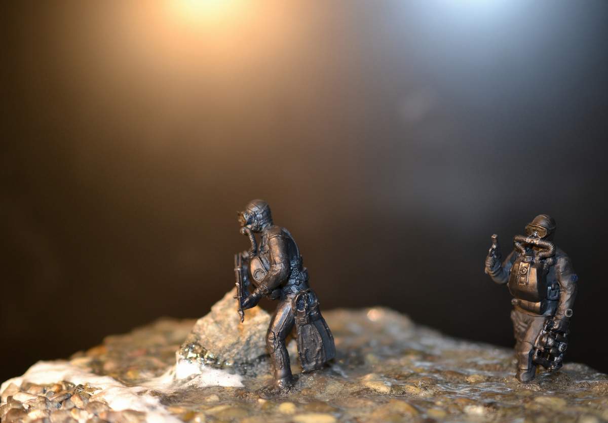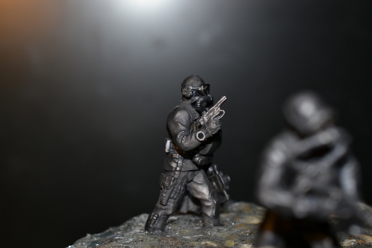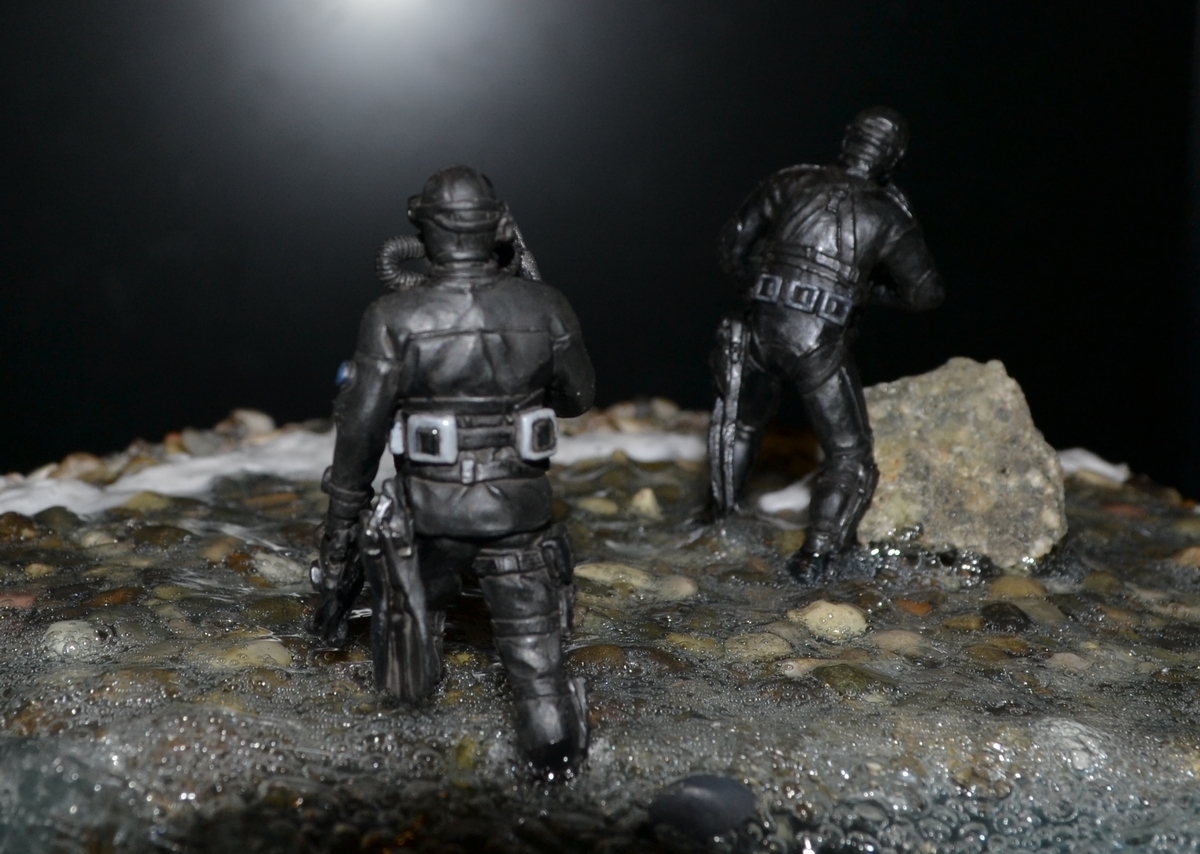 синей тамия. Сам боевой пловец покрашен чёрной матовой из балончика, дал эффект мокрого костюма, грузила и ремни - серая и чёрная матовая тамия. Стекло маски клей титан.