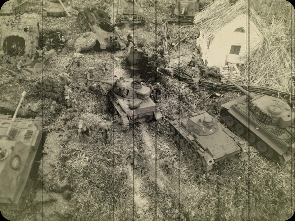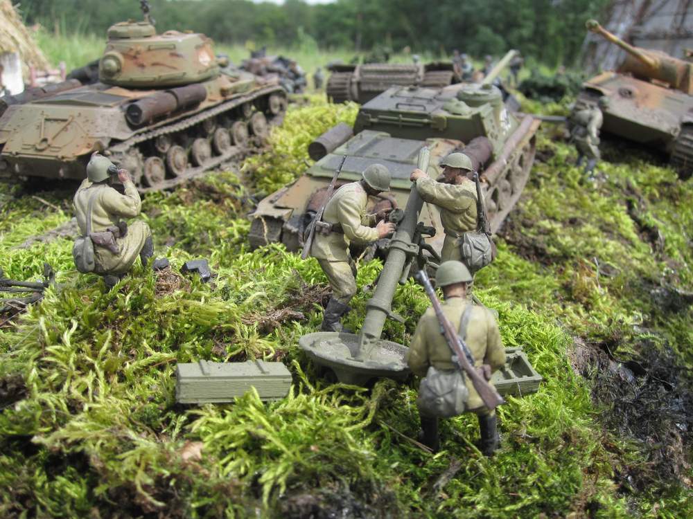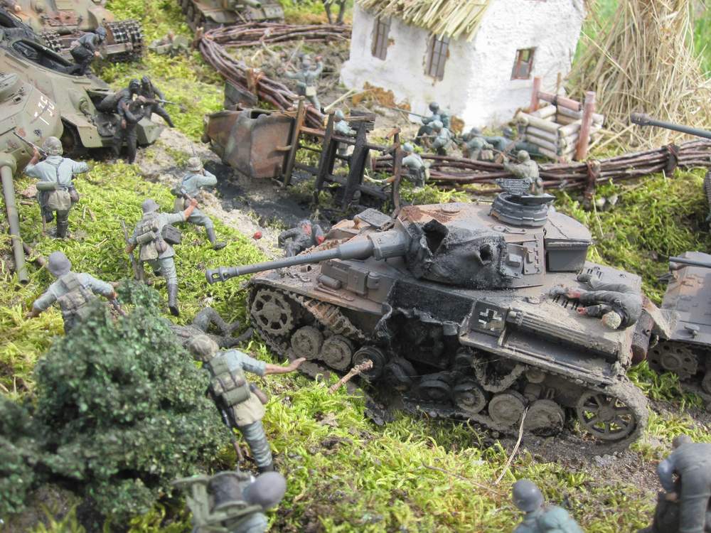 Ещё одна импровизация боя. Размер 1х1, масштаб 1/35. Основание четыре потолочных листа залитых монтажной пеной. Вообще, монтажная пена мне нравится тем, что можно сделать почти уже готовый рельеф. Травка - натуральный лесной мох. Все модели разные. Моей целью не было поставить Советскую танковую бригаду Т-34 против дивизии Мёртвая голова. Краски использовал тамия. Домик покрыт первым слоем глина+ПВА, второй раствор извёстки.