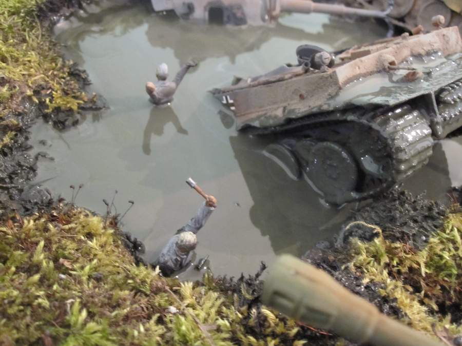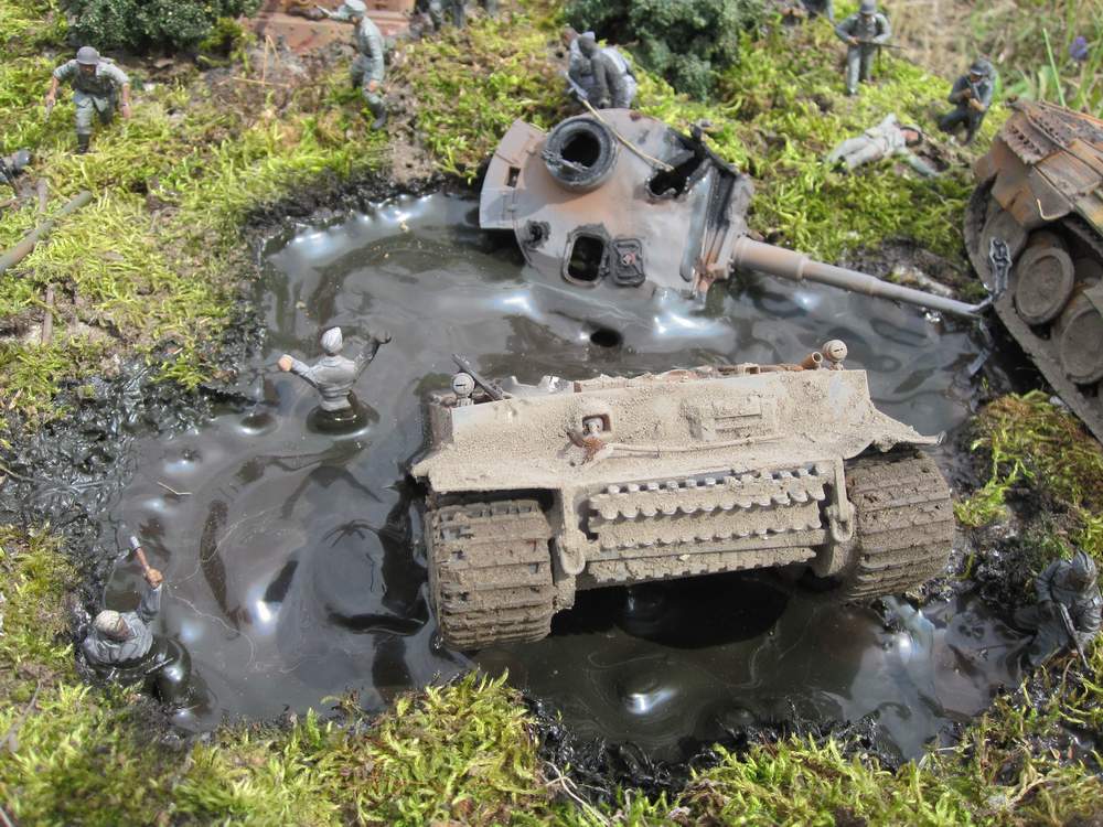 Зрителю проще будет понять задумку автора, если придерживаться некой логики происходящего - если Тигр сначала преодолел жидкую преграду, а на выезде его жахнули, тогда его гусеницы и передняя часть корпуса тоже должны быть уделаны той же субстанцией, в которой он теперь утопает, иначе остается только один вариант - он заехал туда задом. Бывалые мэтры форума часто пишут - чем меньше приходится объяснять зрителю что и как, тем лучше. Успехов!