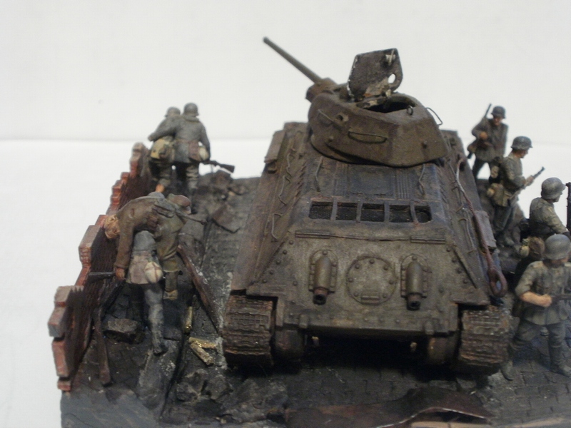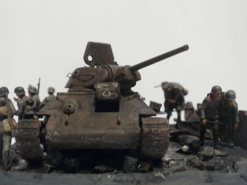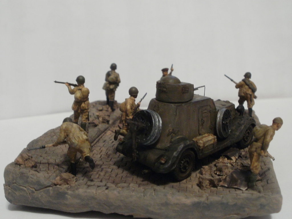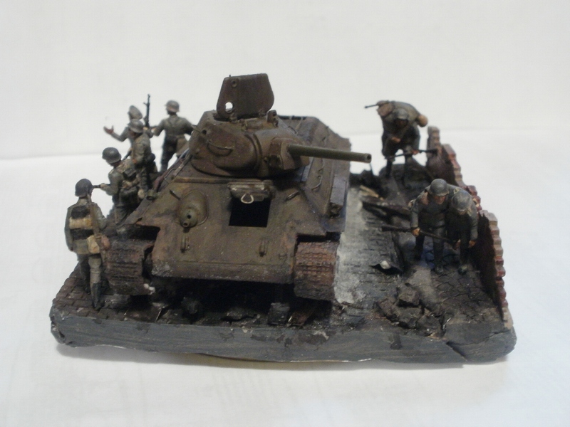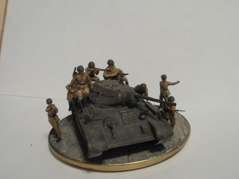 Если судить по позе бойца стоящего справа от танка и по командиру, то машина стоит. Тогда получается что десант готовится покинуть машину и командир должен стоять лицом к ним, указывая куда бежать. А тогда боец бегущий в штыковую либо лишний, либо должен находится позади всех. А то что происходит за пределами виньетки мы, зрители, не видим и Вашего замысла не знаем, поэтому фигуры должны взаимодействовать только между собой. Вот как на Вашей работе с СУ-85: ясно, понятно, никаких вопросов ( разве что к качеству фоток). И здесь: если бы не эти двое слева - была бы первоклассная виньетка. Вообще привлекла, я бы сказал - очаровала, именно компактность виньетки; у самого есть тридцатьчетвёрка, задумался над чем-нибудь подобным.