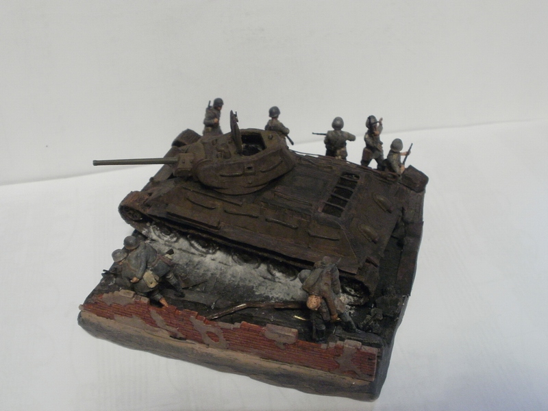 На мой взгляд фигурка бойца лишняя. Вроде и не противоречит по композиции, но какой-то он тут чужой. Танк на основании самодостаточен.