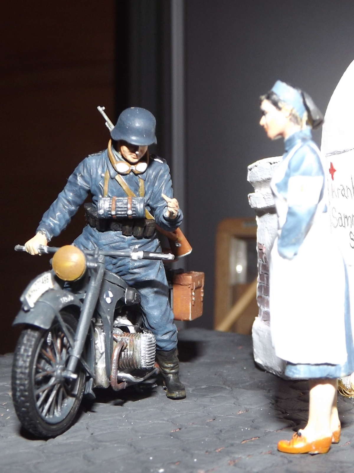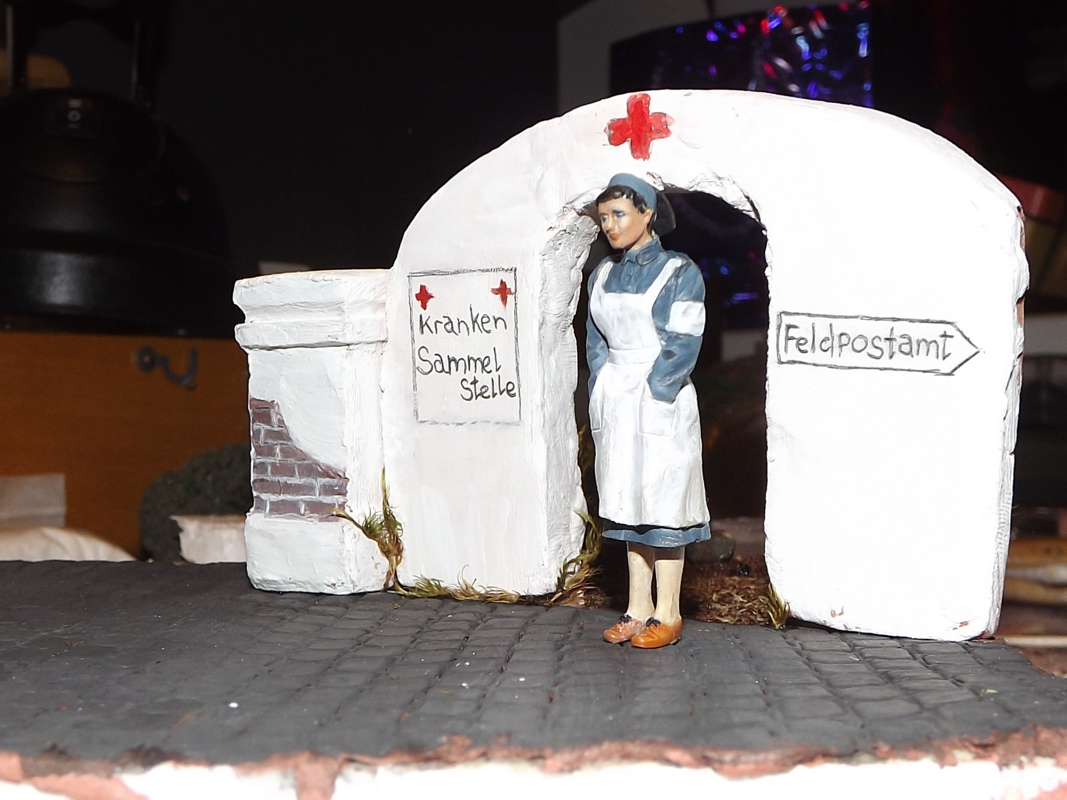 Здравствуйте это моя первая работа сделана была примерно за три вечера(еще не доделанная).В работе использован набор от "Звезда" и фигурка медсестры из эпоксидки покупалась примерно в 99 году окрашено акрилом.Основание виньетки пенопласт,все обмазано модельной глиной и окрашено гуашью.Прошу оценить мою работу, но не строго так как только еще учусь.