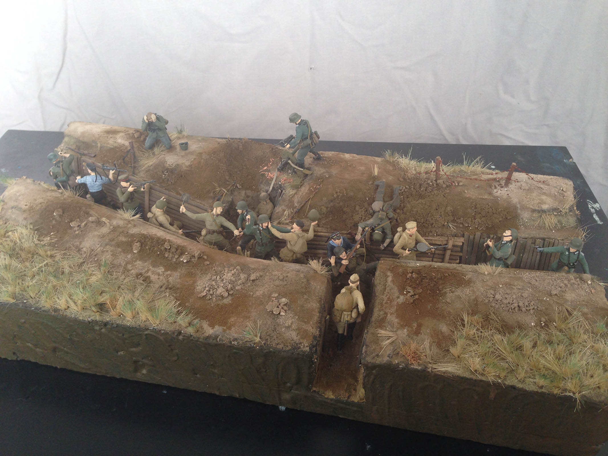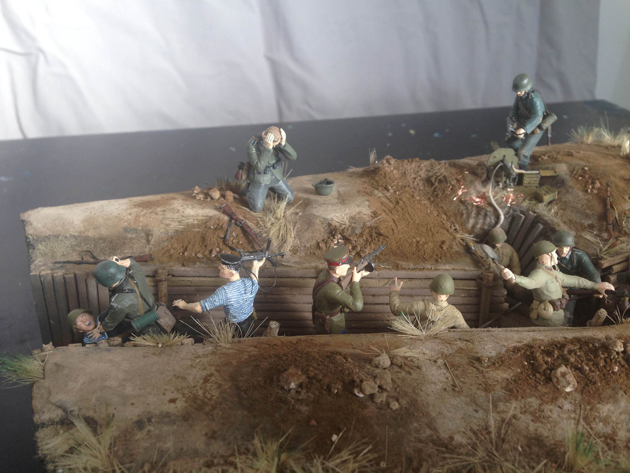 очень понравился ландшафт.Может намного надо было перед окопом змелько побольше набросать,как на той же фотографии,которую показали в сообщении.А почему проволока КРАСНАЯ и как то немного одиноко стоит.я то конечно и так не умею и не разу не пробовал.но кажется,что вот такие ровные пучки немного портят атмосферу.про фигурки уже сказали.