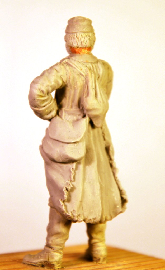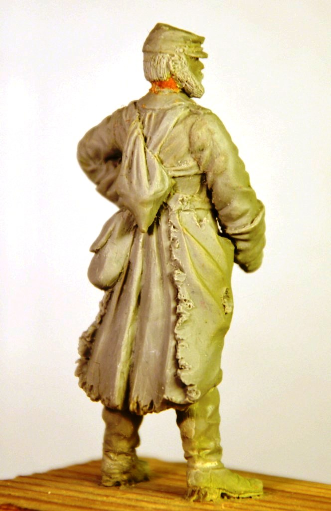 сперва была задумка,что должен быть с сигаретой.Ружьё взял от Chronos Miniatures.Шинель,не знаю как получилось в низу немного потрёпанная.Получился такой воин из боя в тыл,может на перевязку.В низу у каблука забыл снять пластилин,из-за этого вид не очень аккуратный.Теперь осталось продумать подставку