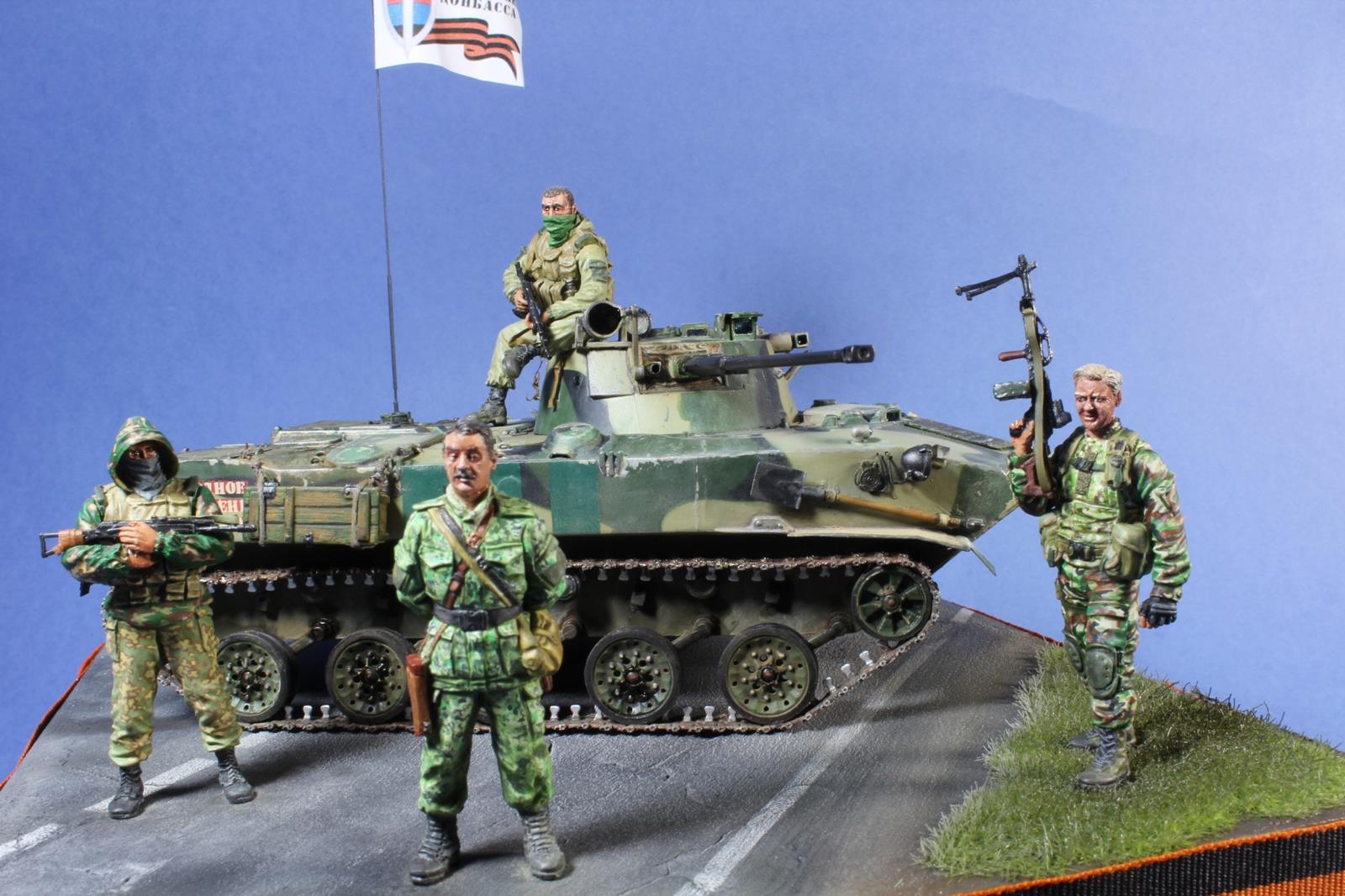 Понравилась роспись камуфляжа) У парня в капюшоне здорово выгорели штаны. Вот только у автоматчика на люке БМД(шки) бандана на лице какая то слишком яркая. В натуре она блеклая серо-зеленого цвета. А так работа симпатичная