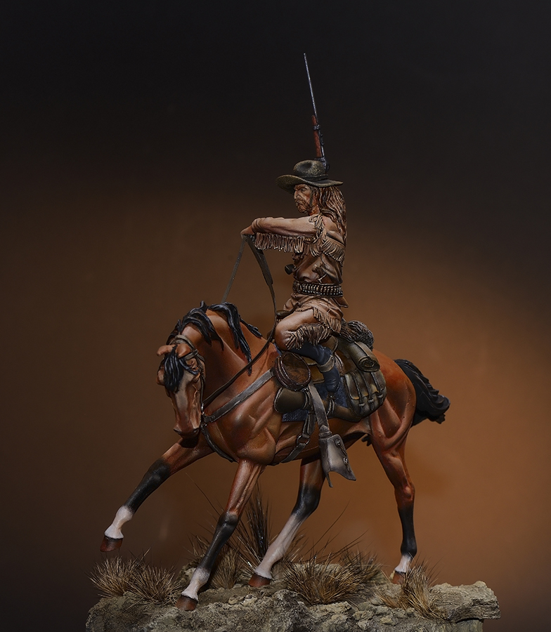 Я думал это ни кто иной, как Баффало Билл, он же Уильям Коуди. Знаменитый охотник на бизонов, создавший в последствии цирковое шоу "Дикий Запад". На мой взгляд имеется портретное сходство. Позы во время охоты на бизонов могли приниматься самые разные. Смотрели "Танцующий с волками"? Там сцена такой охоты отлично показана. Например в тесноте и давке лошадь могла бежать вплотную с бизоном и всадник, чтобы не повредить ногу вполне мог подтянуть ее к седлу.