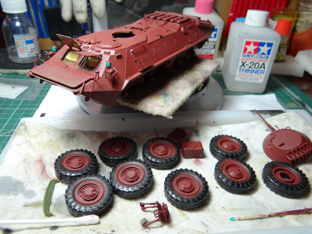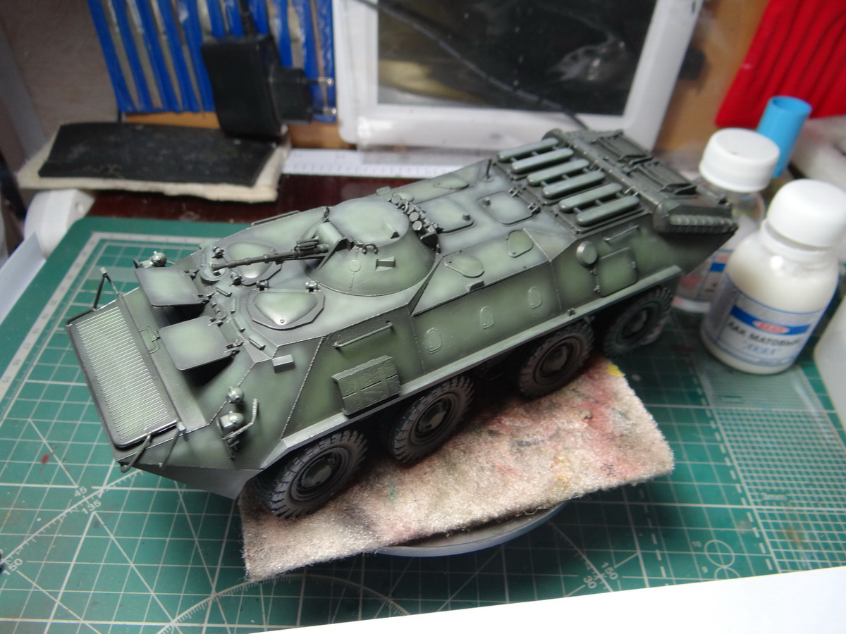 Звездовский БТР-70, все вроде прекрасно, только задняя часть корпуса упорно не захотела состыковаться с нижним и верхним корытом. Сначала хотел сделать двухцветный камо, но нет опыта, плюнул и решил сделать монотонную окраску. Покраску делал по ролику Warfare in Scale Cold War Series Episode 1 - Russian BTR-70 1-35 Dragon Models с ютуба, очень понравилось, показалось что это куда быстрее нежели "классическая испанская школа", нет этой кучи слоев - высветлений, здесь только грунтовка, базовый темный слой, одно высветление от центра поверхностей корпусных деталей и люков, матовый лак от Звезды и фильтр Flat Earth XF-52 поверх. Краски Tamiya XF, солдатики полностью темпера. Потертости - алюминий от Звезды, такой пластиковый флакончик, у Звезды вообще лучшие в мире металлики по натуральности. Пигменты - MIG и Мастер пигмент. Добавил латунную сетку 0,6 на вентиляционную решетку, АГС, запасное колесо и баки КП из набора бэтра.