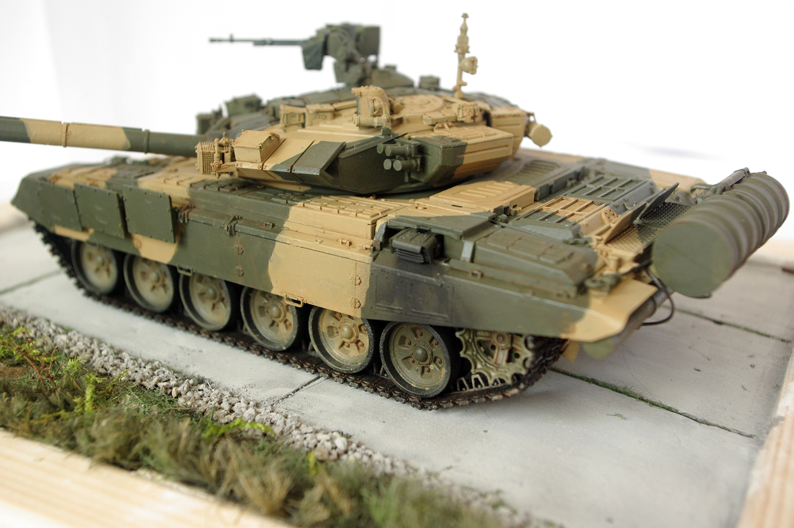 Задумка была проста - изобразить современный танк т-90 на полигоне, как вариант на танковом биатлоне, поэтому легкая пыль и грязь на нем, и стоит он на бетонных плитах. Модель взята из коробки Звезда, только антенна и тросы заменены на садельные. Краска Тамия, матовый лак и смывка из масляной краски Сонет. Хотелось попробовать создать диараму, поэтому сразу за сложное не брался - выбрал бетонные плиты и кусок травы.