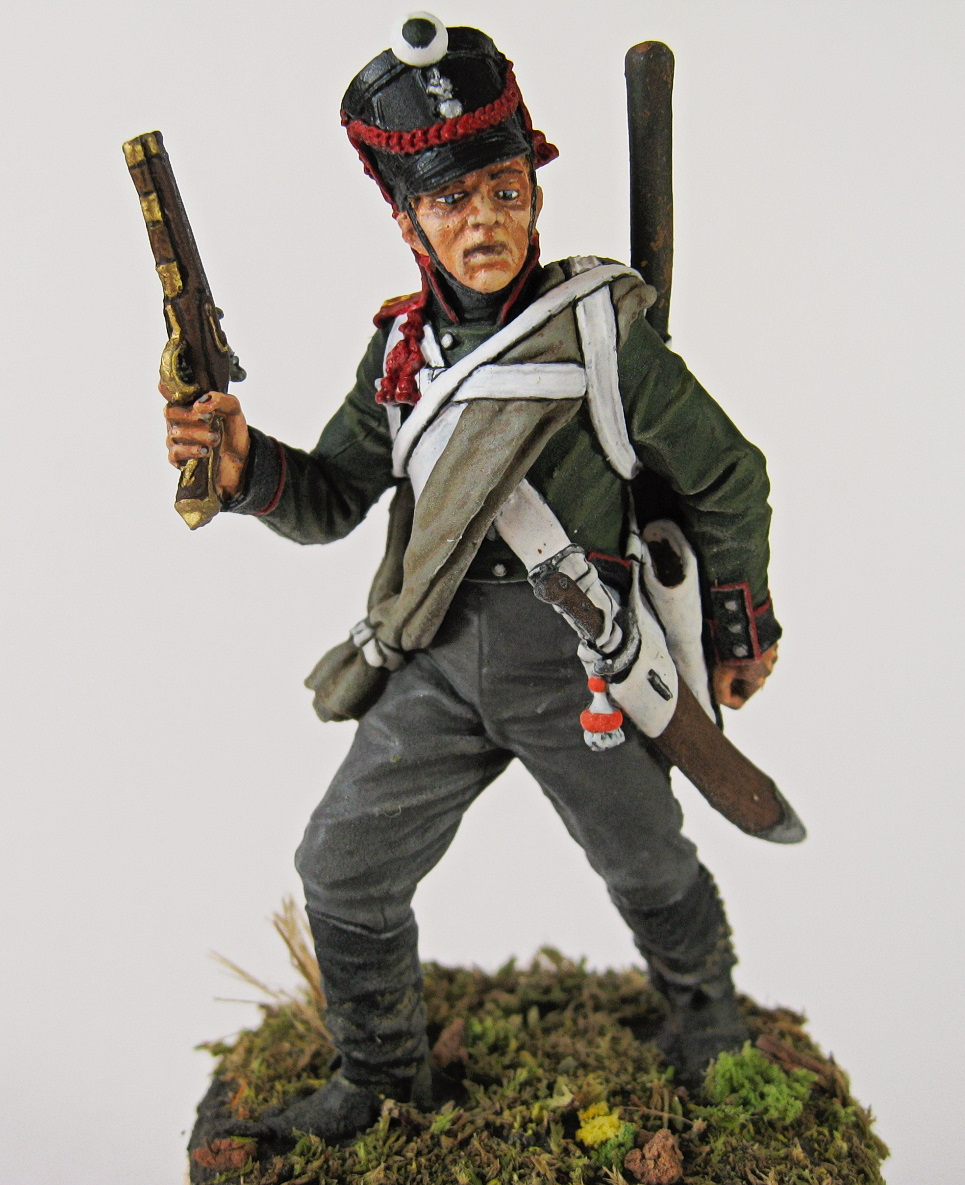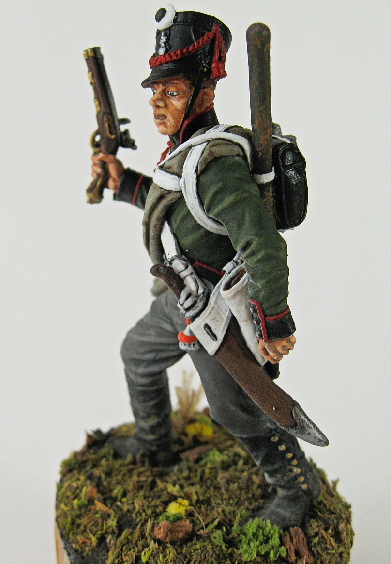 Миниатюра изображает пионера 3-й пионерной роты, 1-о пионерного полка на период 1809-11 годов. Кампанию 1812, а также часть кампании 1813 годов, полк провел в этой же униформе. Относительно оранжевого (или огненного) цвета темляка - есть такое мнение в исторической среде. На некоторых точно датированных родных вещах, скорее оранжевый, нежели желтый. Поначалу, хотел сделать второй полк, однако отринул данную идею вследствие сложностей с рисованием цифры 2 на погоне (пистоль мешал, а мучится не хотелось).