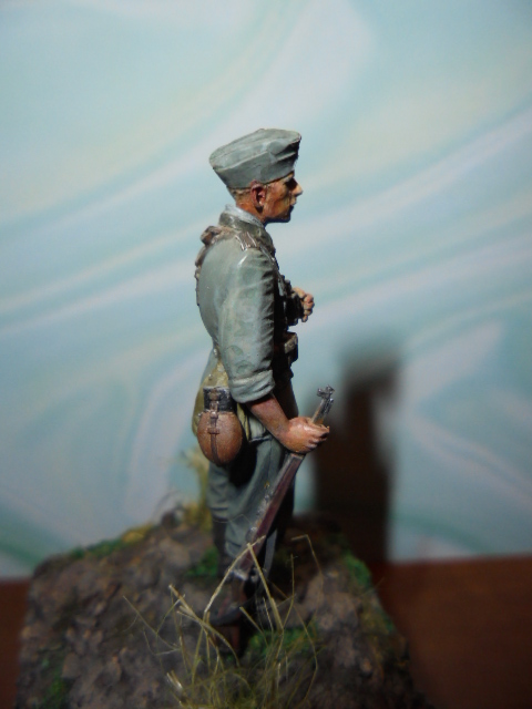Первая любовь-это не название работы,а фигурка,открывшая долгий,фанатичный путь к качественным смоляным миниатюрам.Расписывал где-то шесть лет назад.До сих пор помню,как принес две фигурки"Альпайн" домой и два дня гладил руками аккуратные складки и ремни,боясь приступать к окраске.Помню,как испытал эйфорию от того,как краска сама ложилась на фигуру.Поэтому всем начинающим советую,ну накопите,блин,на качественную смолу или купите вместо пяти плохих одну хорошую.Не верьте корифеям,которые говорят,что тренироваться надо на..."Звезде".Потеряете время,а удовольствие не получите.Начните с"Хронос"."Эволюшен",ну и "Альпайн"со"Сталинградом".Фигурка масштаб 1:35 красилась наборами"Андреа колор",Валеджио.Ничего переделывать не стал,оставил со всеми косяками того времени.Перенес только на новую подставку.Ремни,по-моему делал из ф.т.Фигурка зацепила какой-то внутренней отрешенностью немца от этой ужасной войны.Да,и выставляйте больше своих работ в этом разделе.Не коситесь в сторону галлереи с мыслью"Я так не смогу".С чего-то надо начинать!Всем удачи!