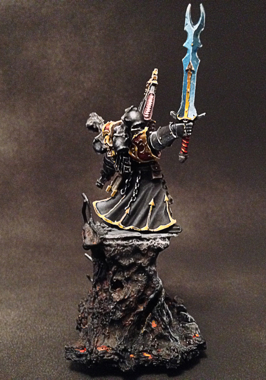 Миниатюра от компании Gameswork Shop - колдун космодесанта хаоса (Warhammer 40k), материал смола, роспись красками Valejo Game color, подставка из утеплителя для стен (не уверен, что он именно так называется), песочек, камушки.