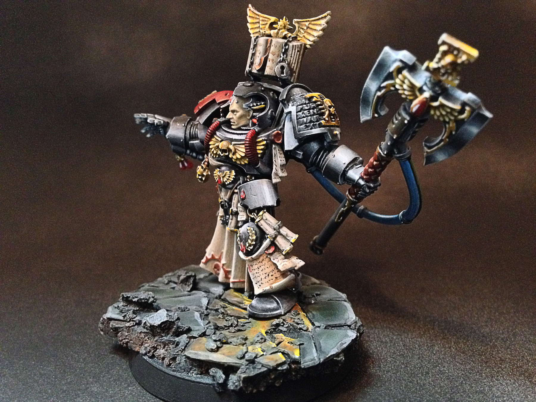 Миниатюра компании Gameswork Shop, библиарий в терминаторской броне, материал пластик, роспись красками Valejo, подставка пробка, пластик.