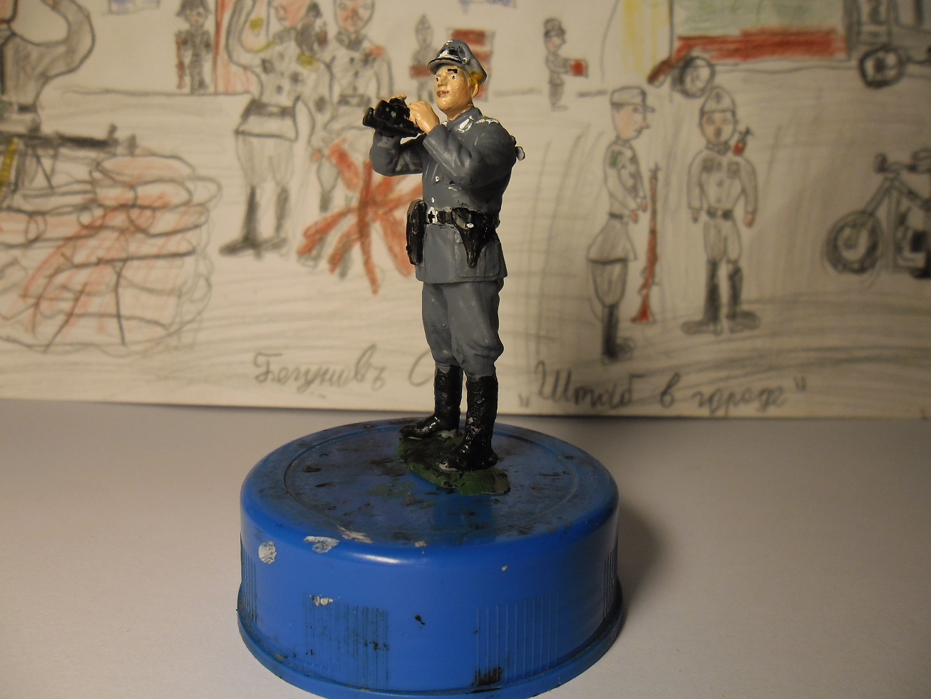 А теперь посмотри внимательно свои фото и исправь ошибки:непрокрашенные места надо аккуратно прокрасить,заляпанные места исправить,кожаный ремень и планшетку перекрасить в темнокоричневый цвет.Если есть матовый лак,покрасить всю фигурку,чтобы не блестела.Как исправишь,пересними и выложи здесь же,а мы посмотрим.Рисунок кстати классный.