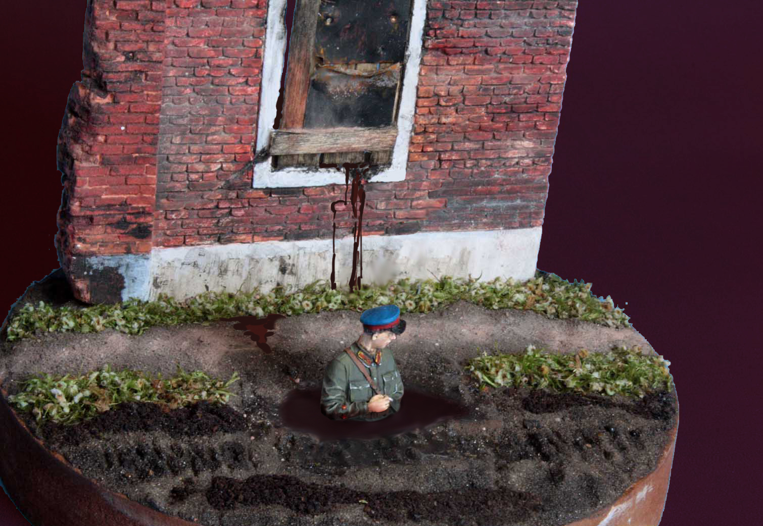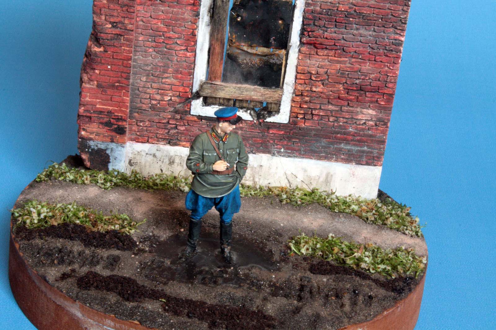Идея была такая. Изобразить офицера НКВД , стоящего у развалин в луже грязи…