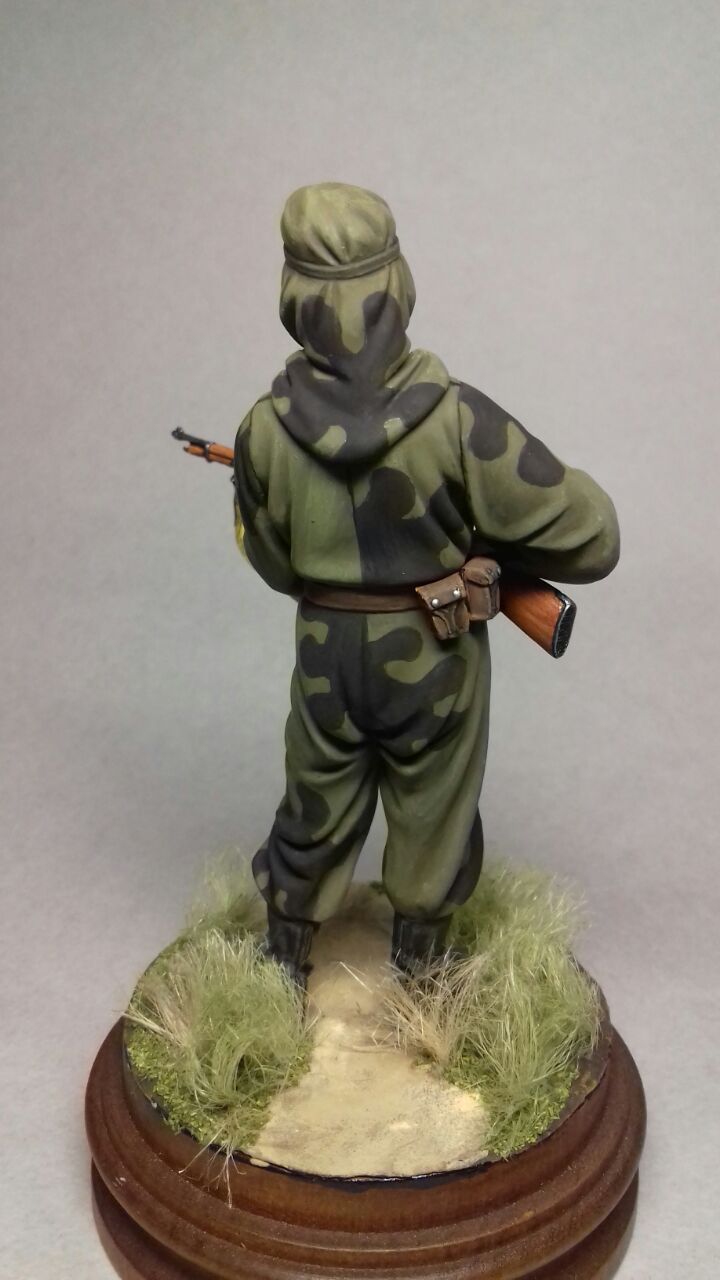 Поддерживаю Павел'а - снайпер существо пресмыкающееся, а посему должен быть изгваздан по погоде.Особенно нуждаются в загрязнении локти, колени,пятая точка... Кстати, испачканность дополнительно камуфлируют стрелка. На винтовку можно было намотать имитацию раздербаненного джутового мешка- снайперы это уважают...
