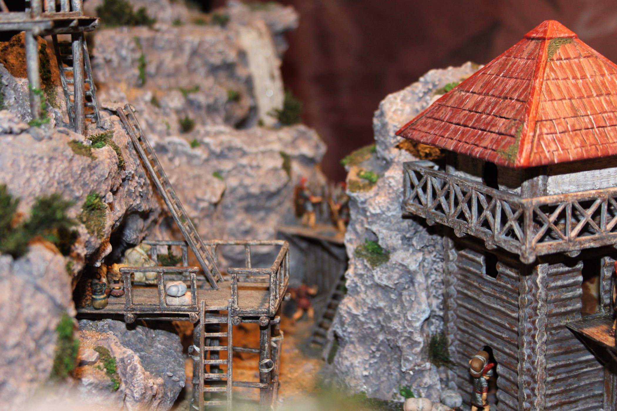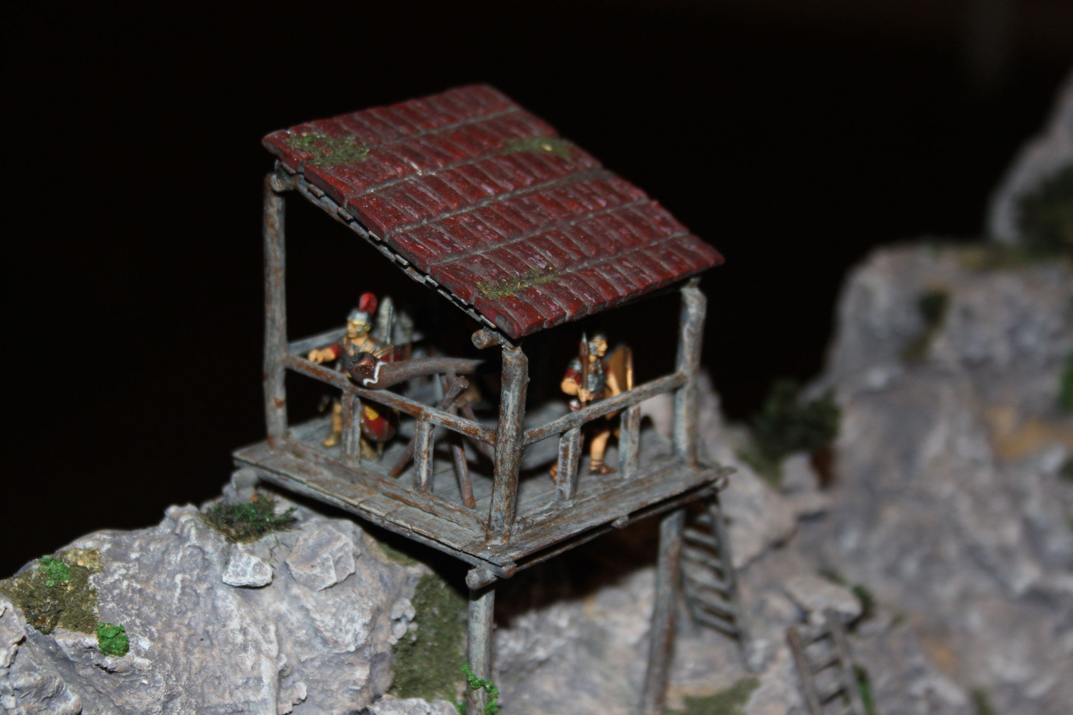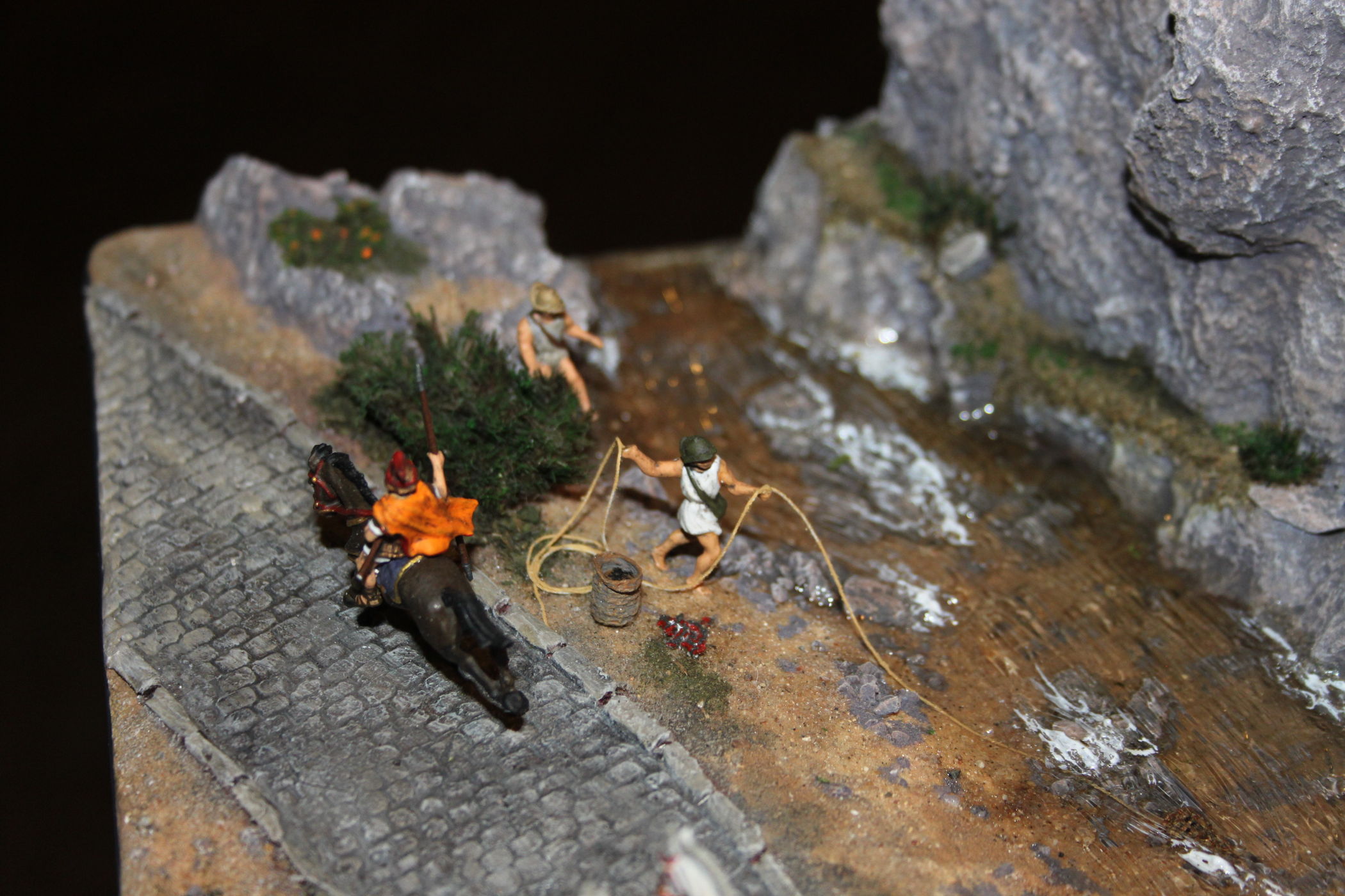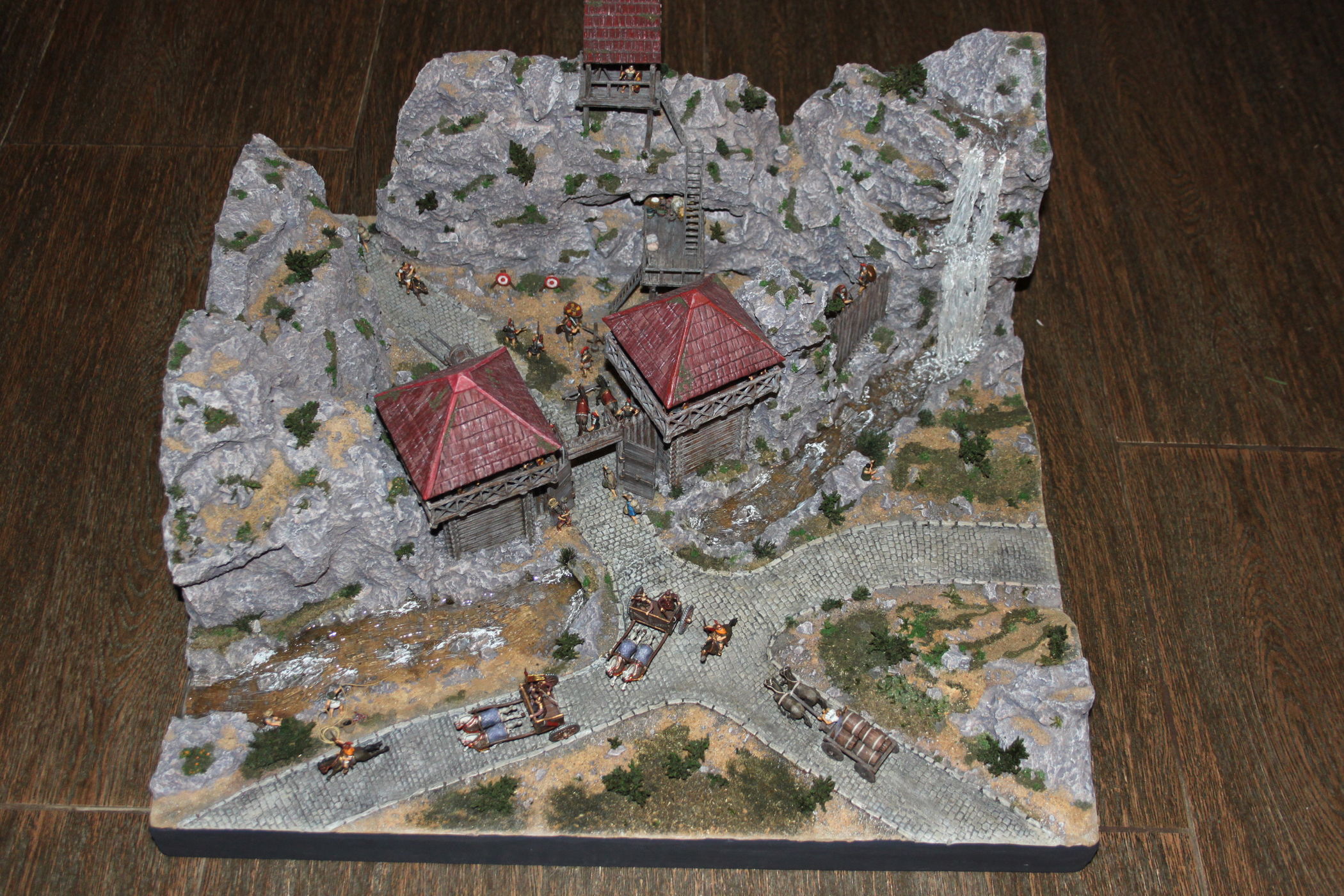 Коротко о работе - Размер диорамы - 548х503х257 (в мм) Масштаб - 1:72. Фигурки - "Звезда". Крепость - "Звезда" - дорабатывал под Римский дизайн. Внутренние строения (промежуточная площадка и сигнальная вышка)- самострой. Колесницы - фирменные. Телеги и утварь делал сам. Мирные жители - из греческих наборов "Звезды" Фигурки почти все прошли конверсию. Краски - акрил (звезда, тамия, питер). Все фигурки покрыты матовым лаком. Горы - вспененный полистирол и поролон. Вода - прозрачная эпоксидная смола. Водопад - силиконовый герметик. Кусты - мох покрытый измельченными и крашенными опилками. Трава - пакля и измельченные опилки. Брусчатка - обожженная и крашенная глина для лепки.