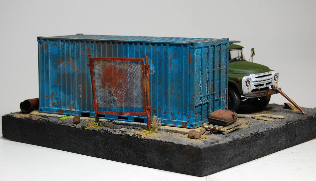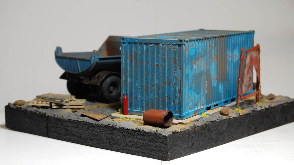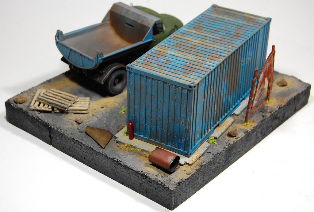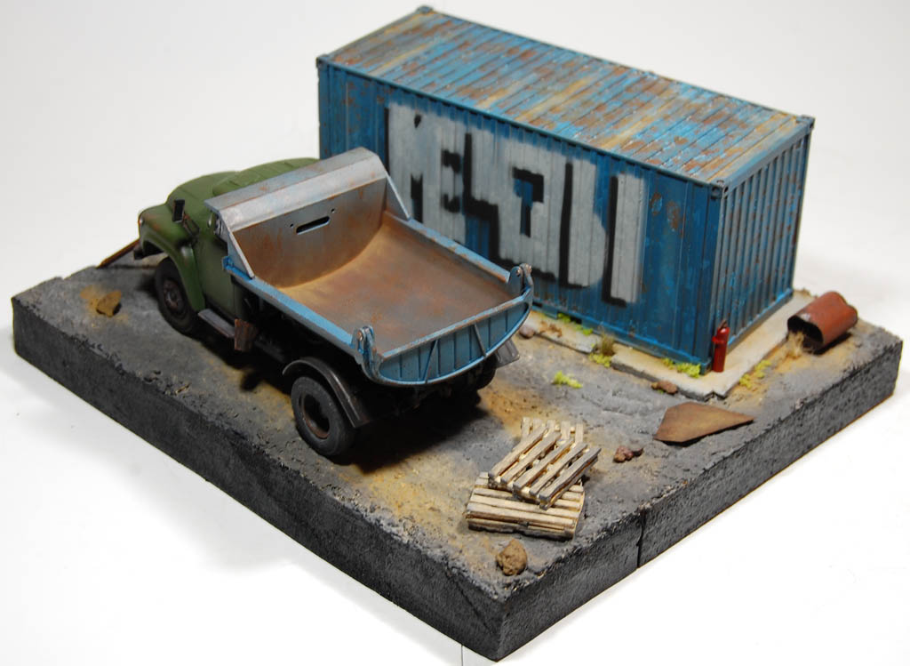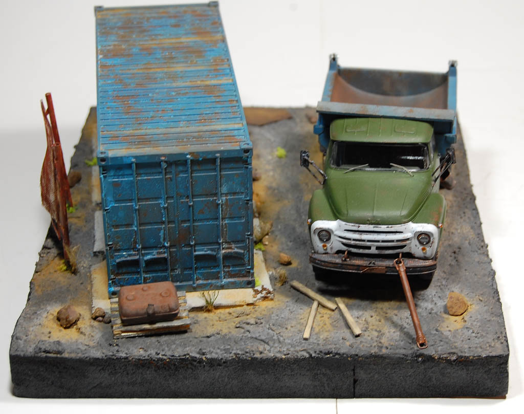Материал подставки пенополистирол,имитация земли с помощью шпаклевки по дереву и песка и покрашено Гуашью)Сам самосвал покрашен акрилом Тамия