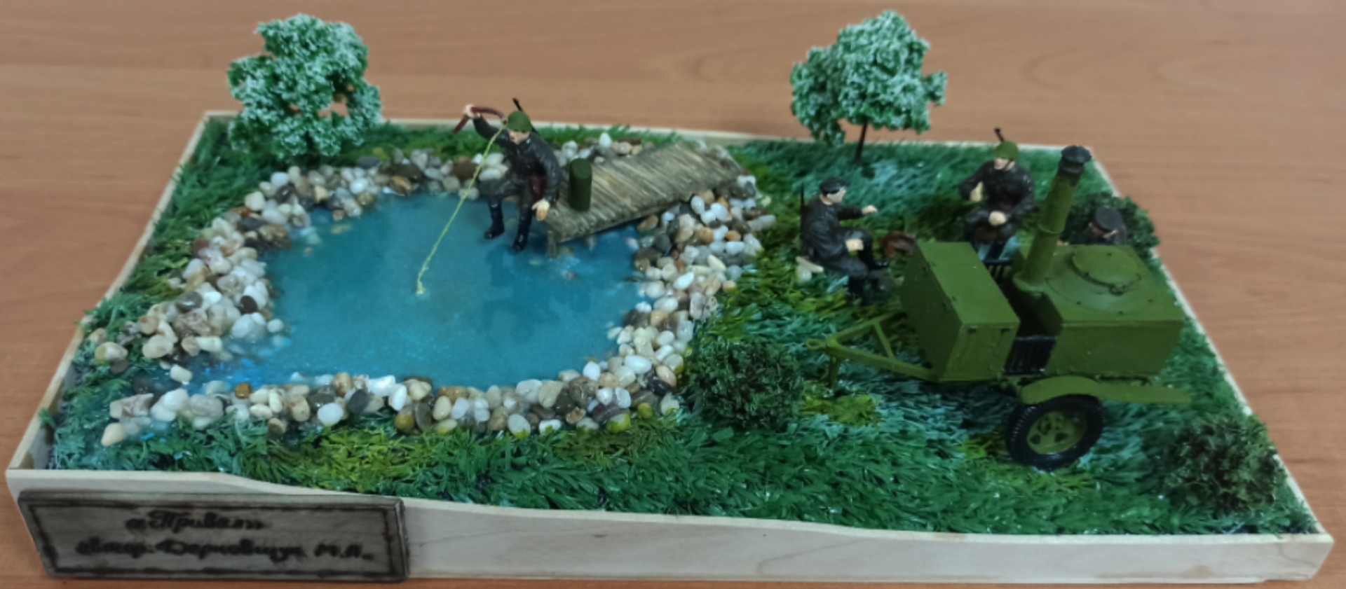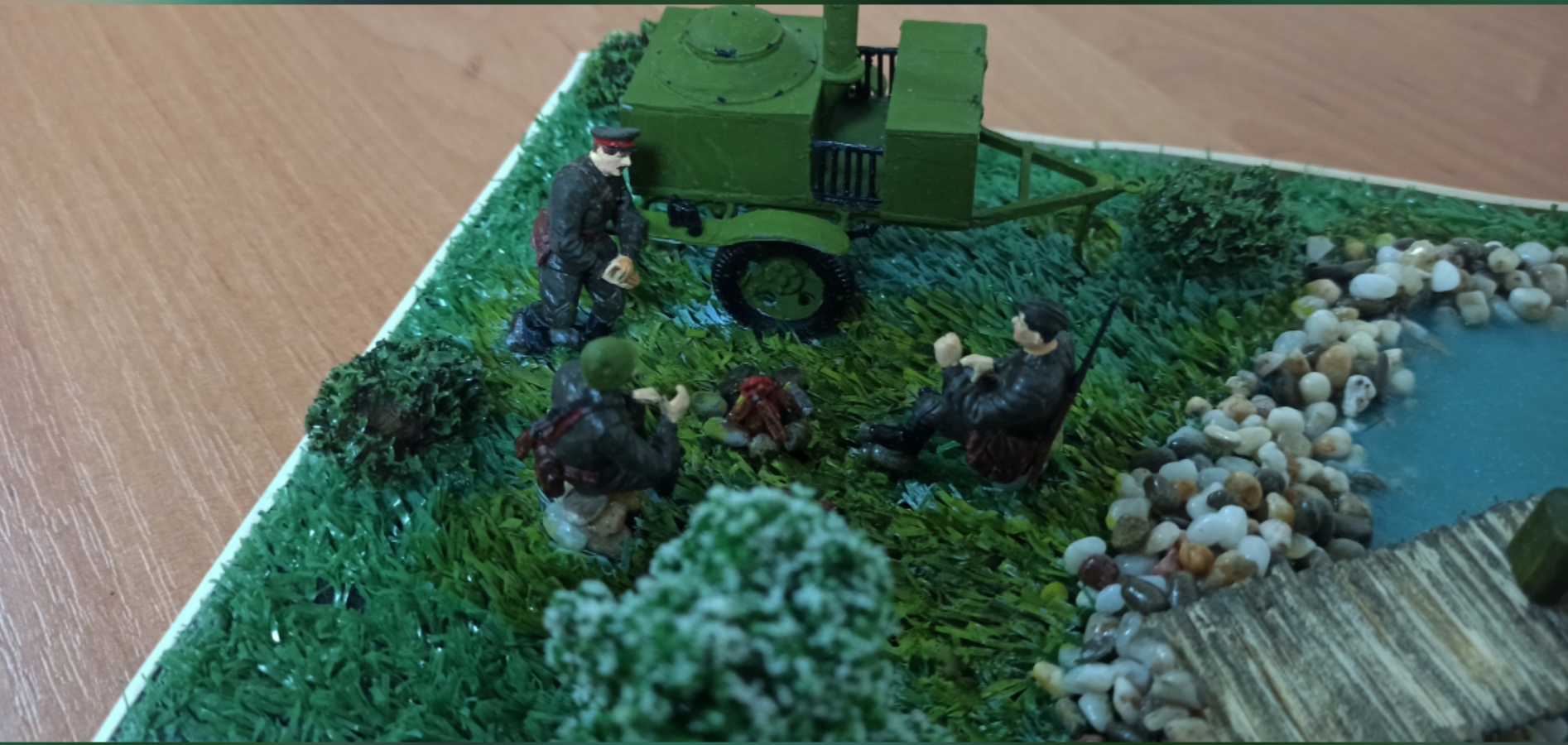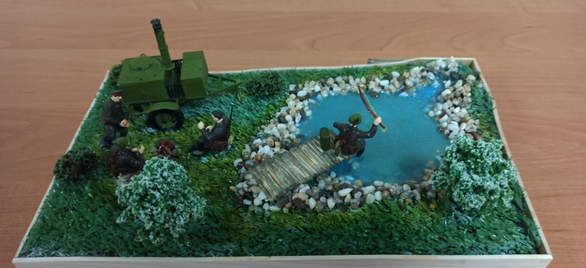 Не ловят рыбу в джакузи! Да, именно джакузи у Вас получилось - хоть и дизайнерское, обложенное искусственным камнем. Натуральные камни на диораме 1:35 (не говоря уже про более мелкие масштабы) выглядят НЕ натурально: их текстура оказывается не масштабной и смотрится нарочито. К тому же размер: при пересчёте в масштаб это получаются полуметрового размера валуны. По возможности избегайте использования натуральных материалов: они слишком узнаваемы. Да и где Вы видели берег естественного водоёма, заботливо обложенный валиком камней, возвышающимся над окружающим ландшафтом? Берег должен идти вверх по мере удаления от уреза воды.
