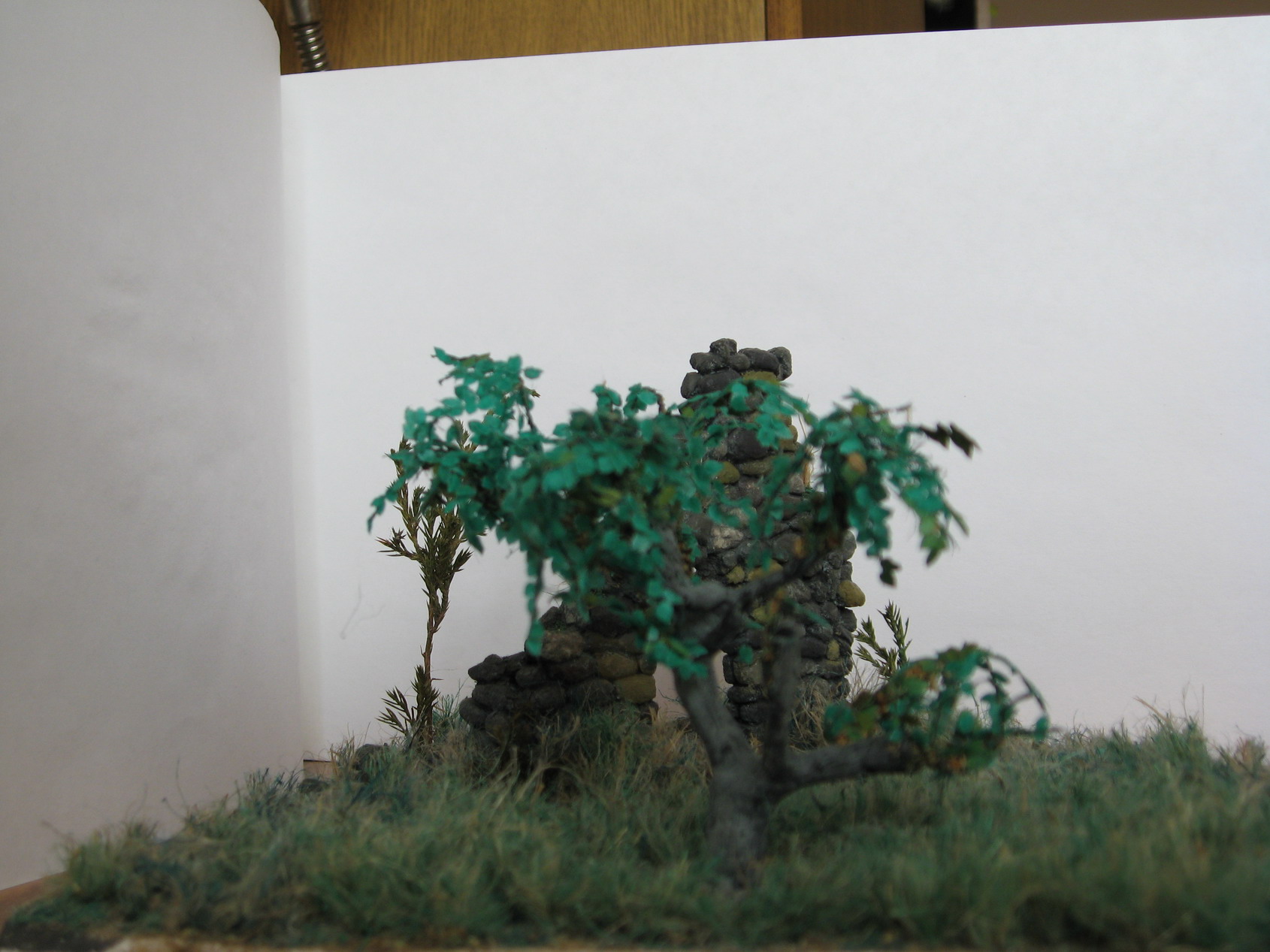 Всем привет!Моя винетка готова на 80%!Так как Это первая работа,хочу услышать ваше мнение о ней,Основание-гипс,трава-пакля,развалины-гипсова форма,обработаная и тонированая,дерево-проволочный каркас,шпаклевка,листья-калька.Окрашено художественным акрилом,развалины-эмалью!