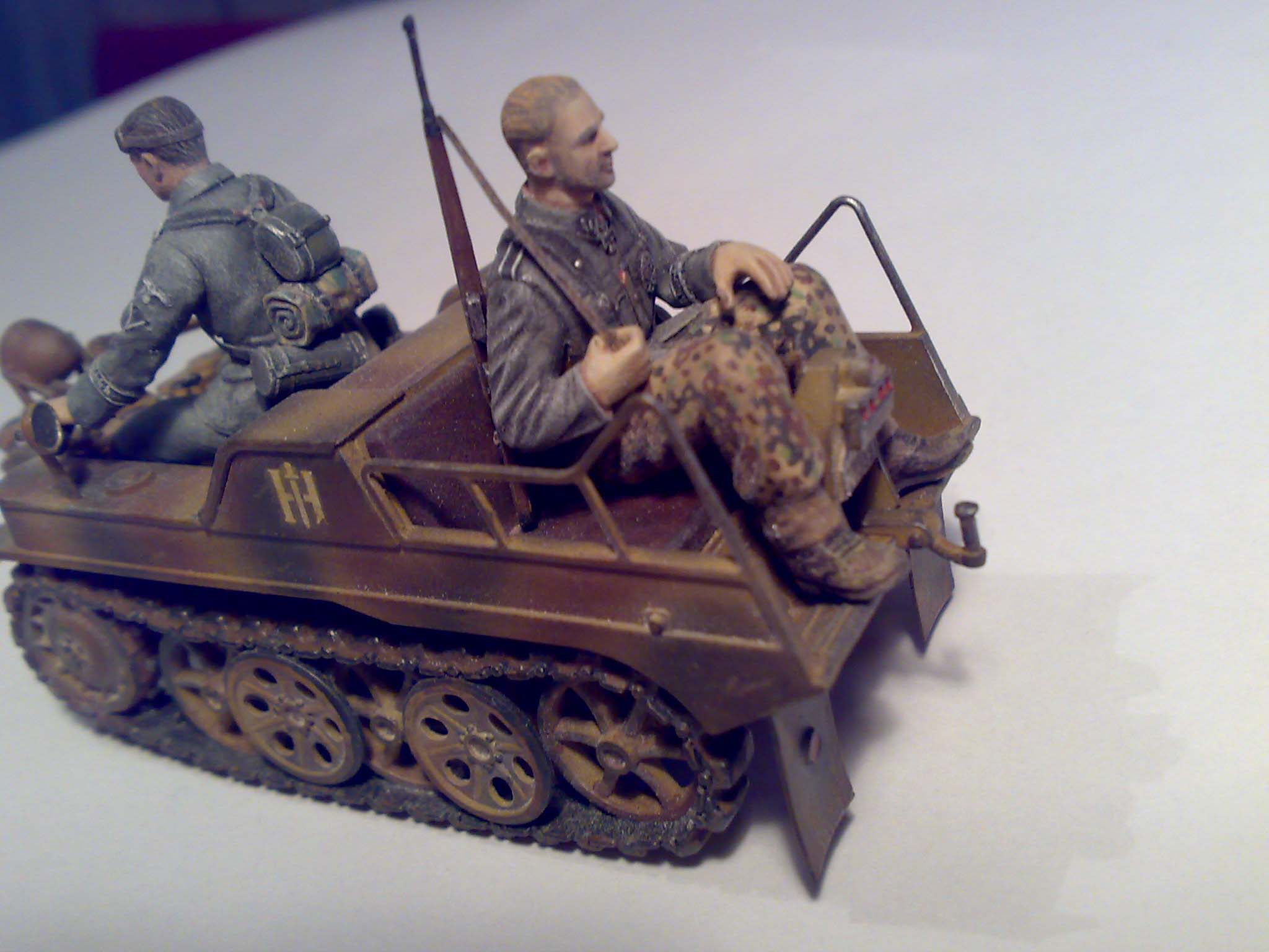 Неплохо сделано. Хотя Ketten еще не попадал в сферу моих интересов :) думаю, что оживить грубоватенькую тамиевскую модель могла бы какая-нибудь дополнительная деталировка, вроде проводки в районе руля. Ну и для настроения можно подложить в кузов что-нибудь такое, что могло бы как-то охарактеризовать персонаж (это, если будет виньетка). Не знаю как у гансов было по уставу :) но мне так ехать с винтовкой было бы неудобно. Я бы ее положил на колени или поставил бы прикладом на ступеньку между ног.