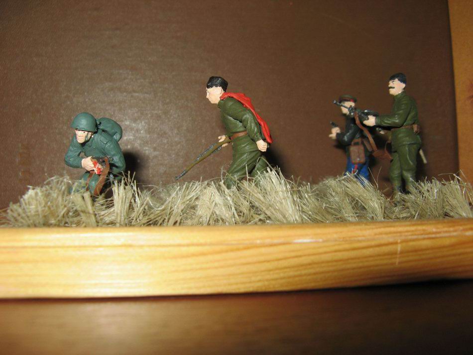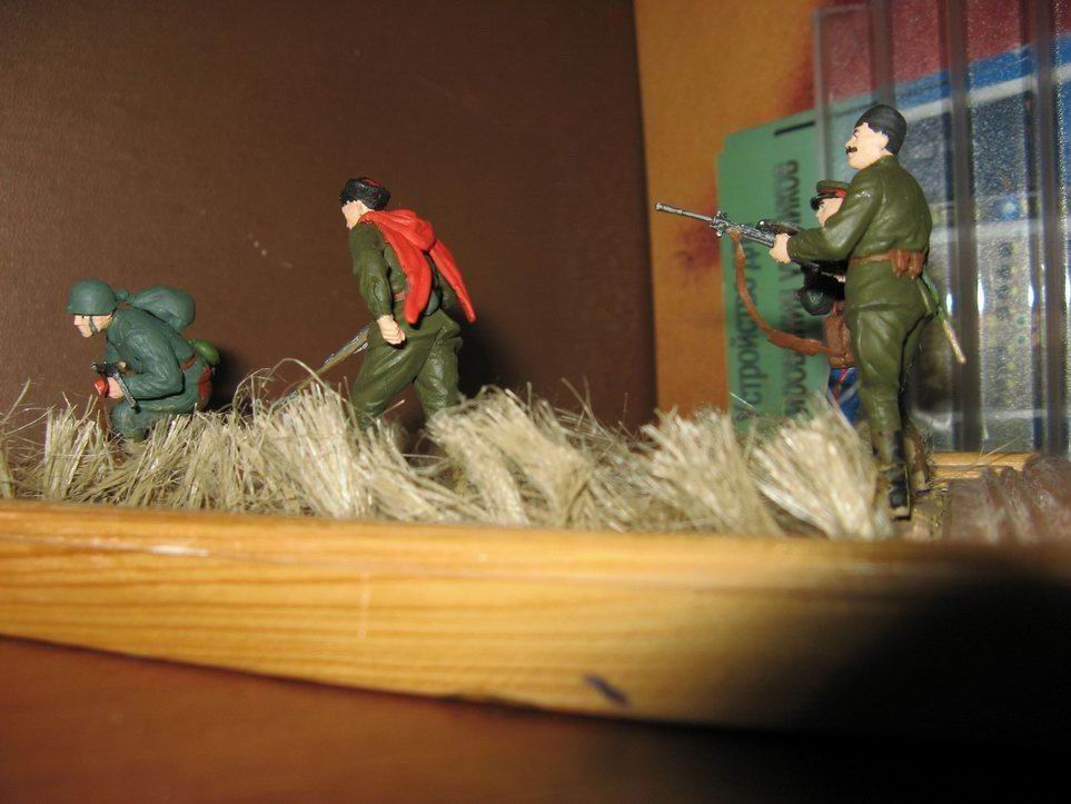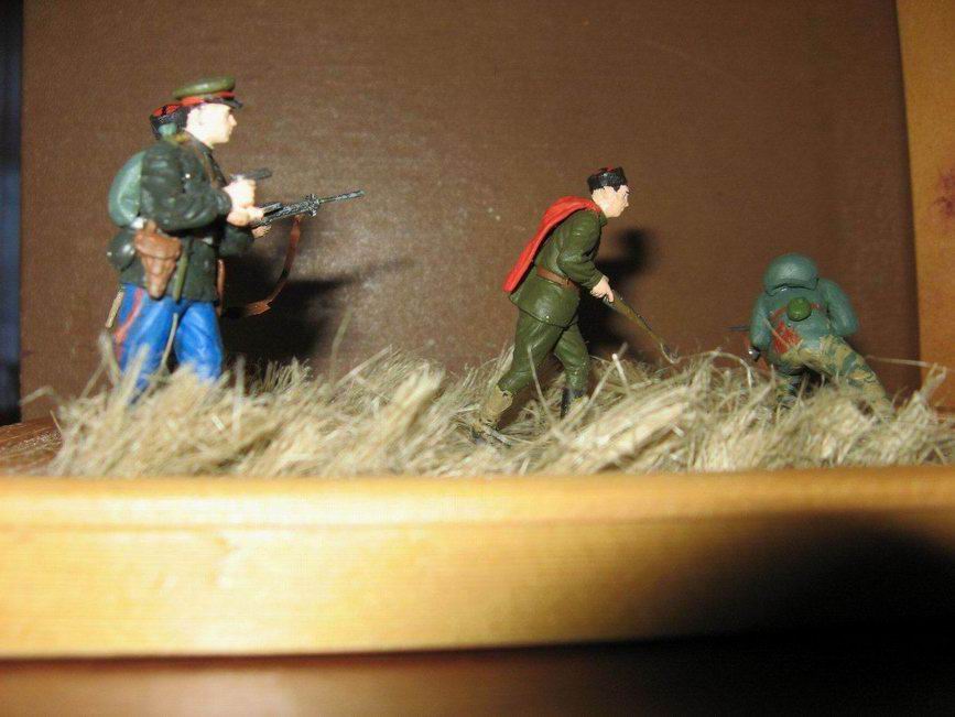 Это моя первая работа, использован солдат из набора Звезды "Танковый десант" и набор от Алангера "Сталинские казаки", немного добавил обвески от звезды, основание-шпатлёвка и сантехничечкий лён. Всё класилось акрилом от Звезды и тамии,а так же эмаль от Звезды.