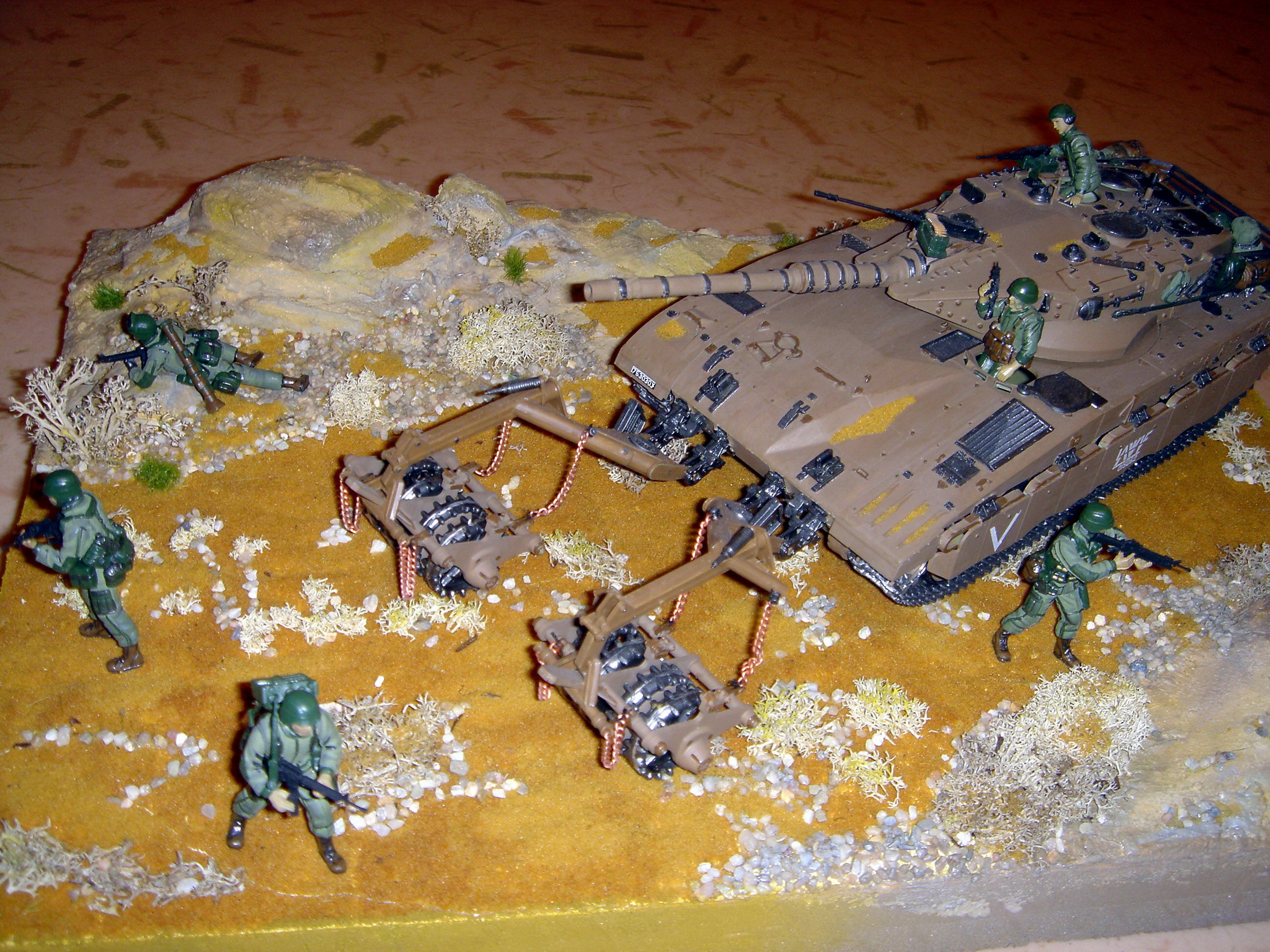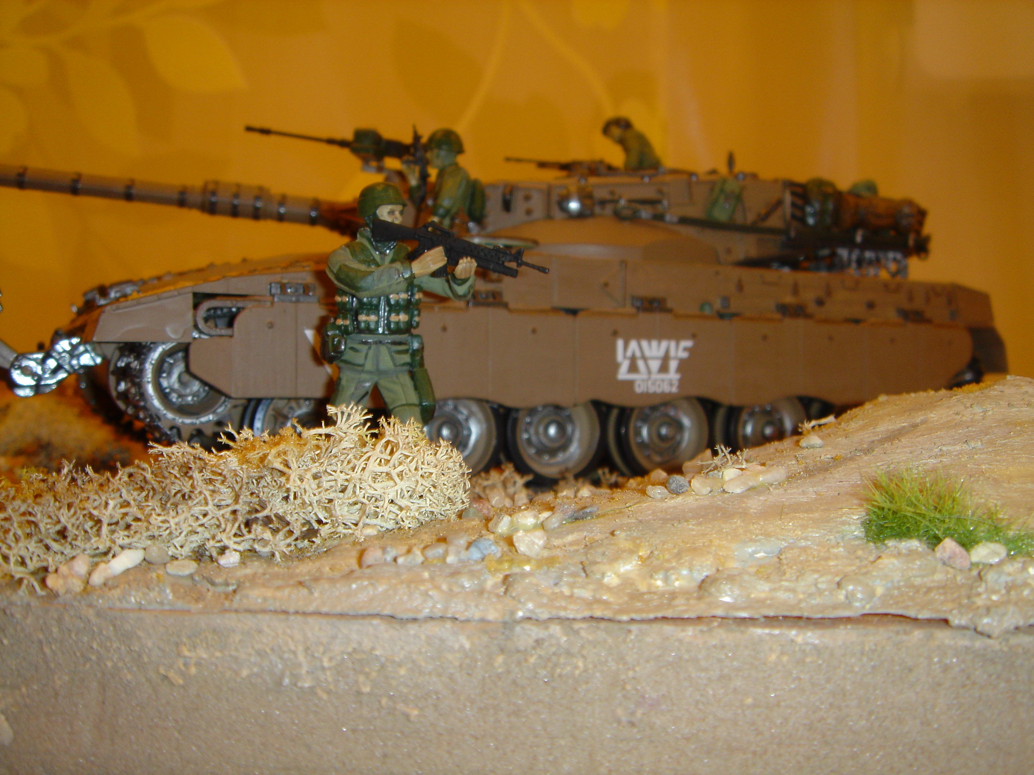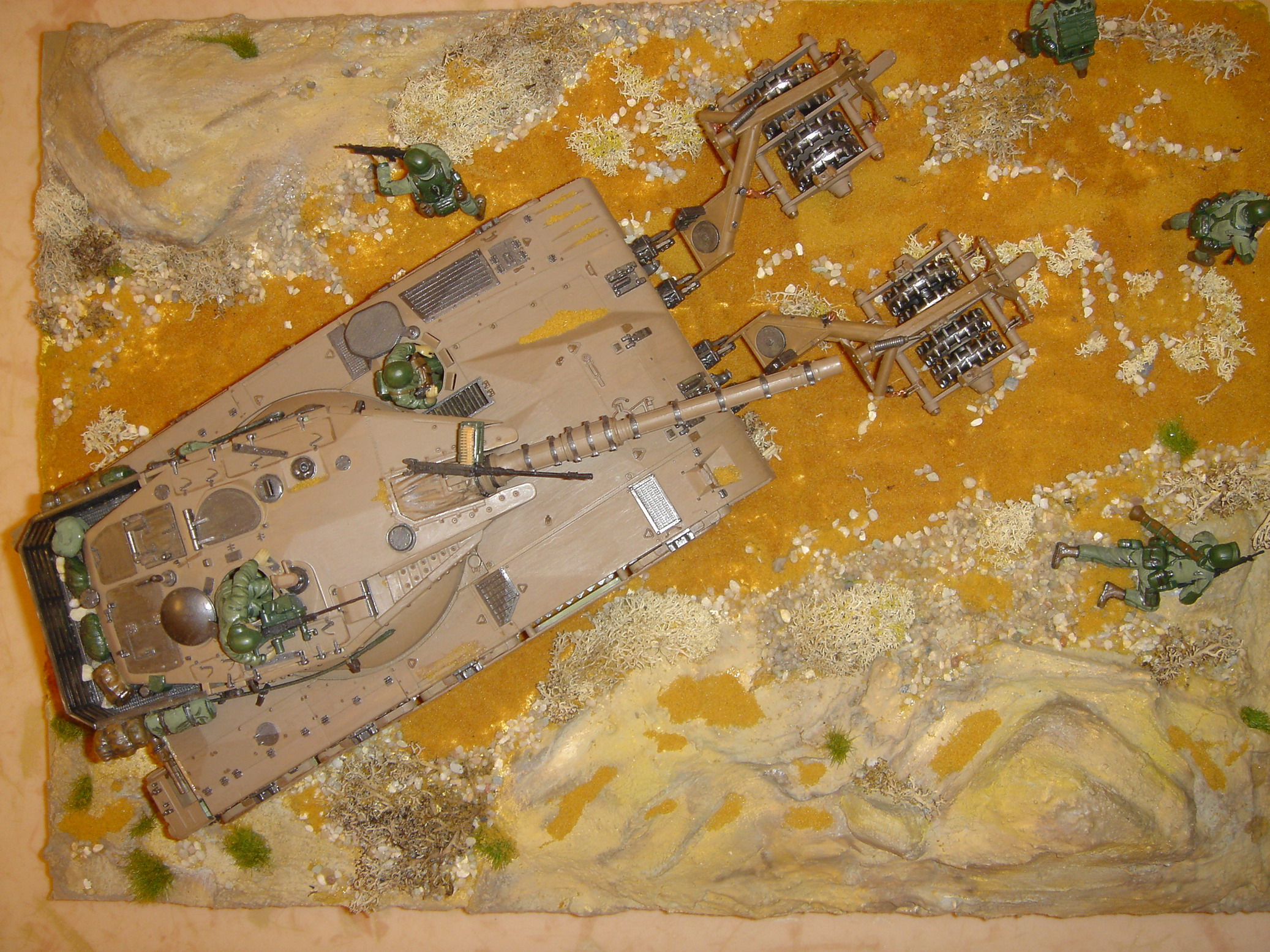 Полностью поддерживаю Бориса Харламова: действительно приятно,когда девушки проявляют интерес к такому. Часами сидеть за столом над кучей деталей и схем-это уже прогрес и проявление своего терпения. Ну а работа требует доработок. Это дело опыта. Скажу только одно: что фигурки следовало бы переставить: на танке установлены так называемые копалки, противоминки, в бою или городской стычке такой танк становится легкой целью. На мой взгляд на диораме танк едет по минному полю, а солдаты идут перед ним. Как-то не правильно получается солдаты по минке перед танком. С уважением....